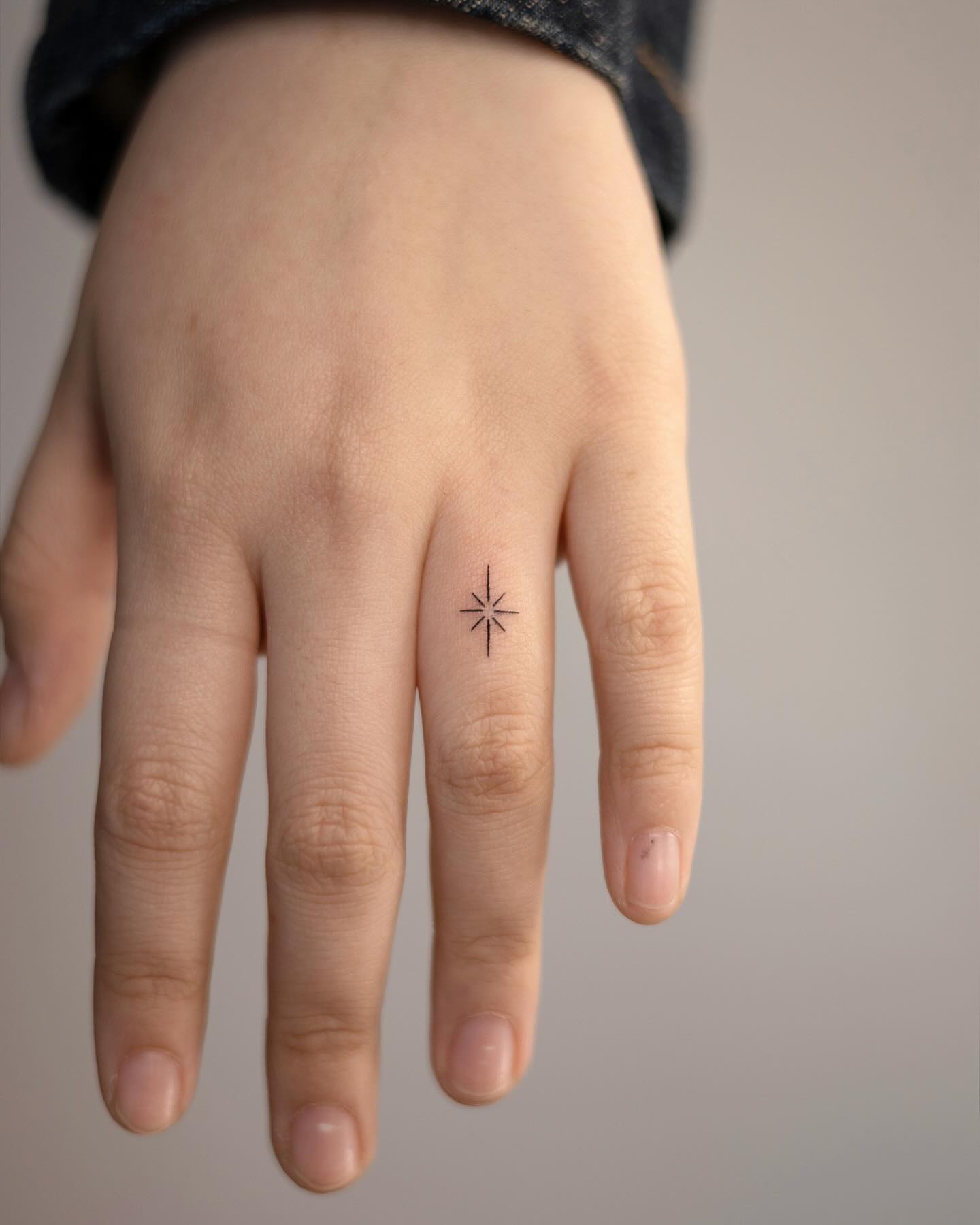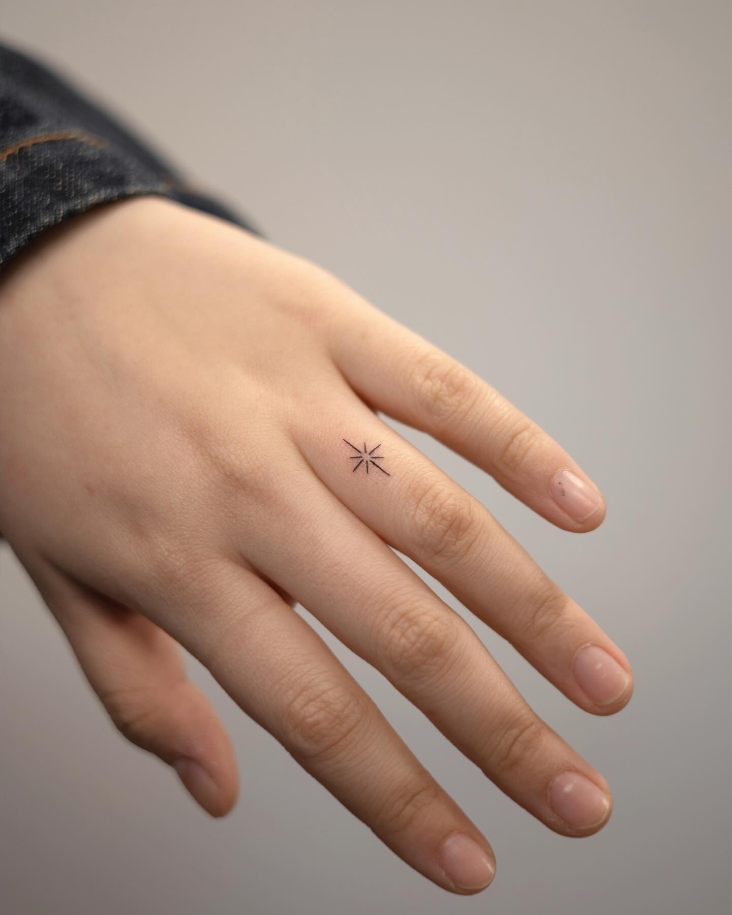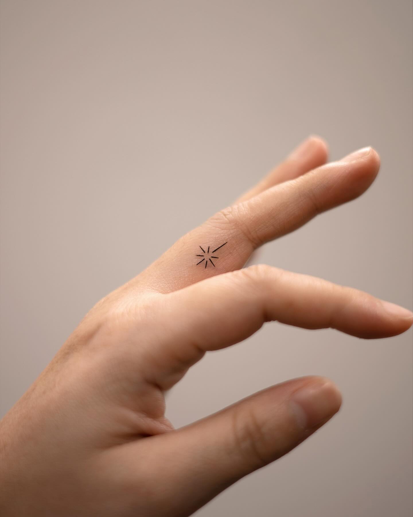 This image showcases a captivating starburst tattoo on a delicate hand, highlighting its playful yet elegant design. The simple lines and bold shape create a striking contrast against the skin, making it a perfect choice for those who appreciate fine tattoos. Choosing a small, meaningful tattoo like this can be a beautiful way for women to express their individuality.