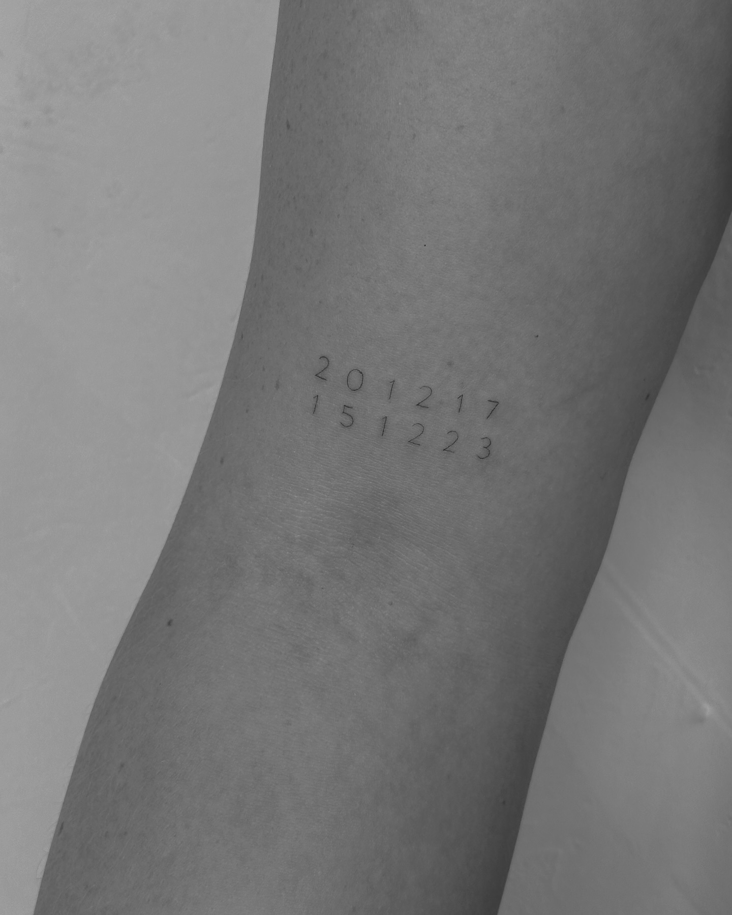 This tattoo features a series of meaningful numbers that tell a personal story. Each date could represent significant moments, like birthdays or anniversaries, creating a unique connection for the wearer. When choosing a tattoo, consider designs that celebrate your own important milestones, making it a beautiful reminder of cherished memories.