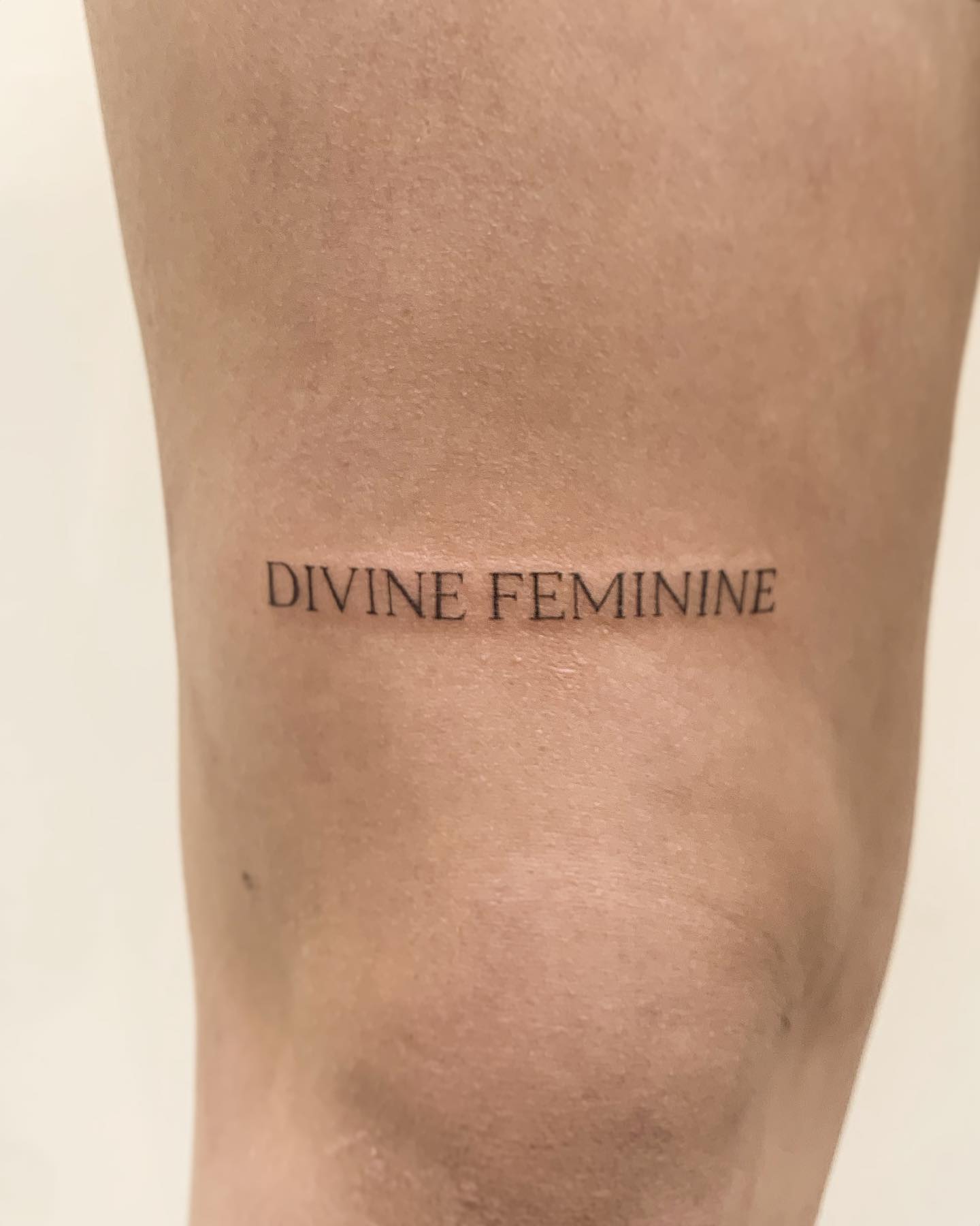 This tattoo beautifully showcases the phrase “DIVINE FEMININE” in a sleek, modern font, making a powerful statement. The simplicity of the design emphasizes its meaningful message, perfect for those who cherish femininity and strength. Choosing a phrase that resonates personally can transform a tattoo into a treasured piece of art.