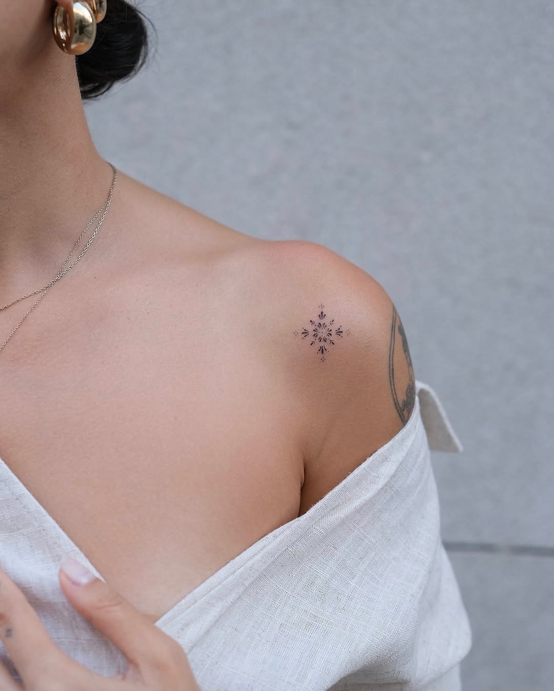 This image showcases a delicate snowflake tattoo nestled on a woman’s shoulder, creating a beautiful focal point. The fine lines and intricate details of the design add an elegant touch to her look, symbolizing uniqueness and individuality. For those considering fine tattoos, choosing a design that resonates personally can make it even more special.