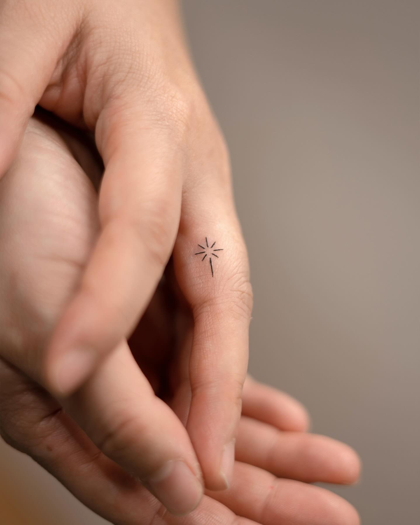 This image captures a delicate tattoo of a starburst on a woman’s hand, symbolizing light and guidance. The gentle touch of hands suggests a deep bond, making it a perfect representation of love and support. Choosing a fine tattoo like this can serve as a daily reminder of the connections that brighten one’s life.