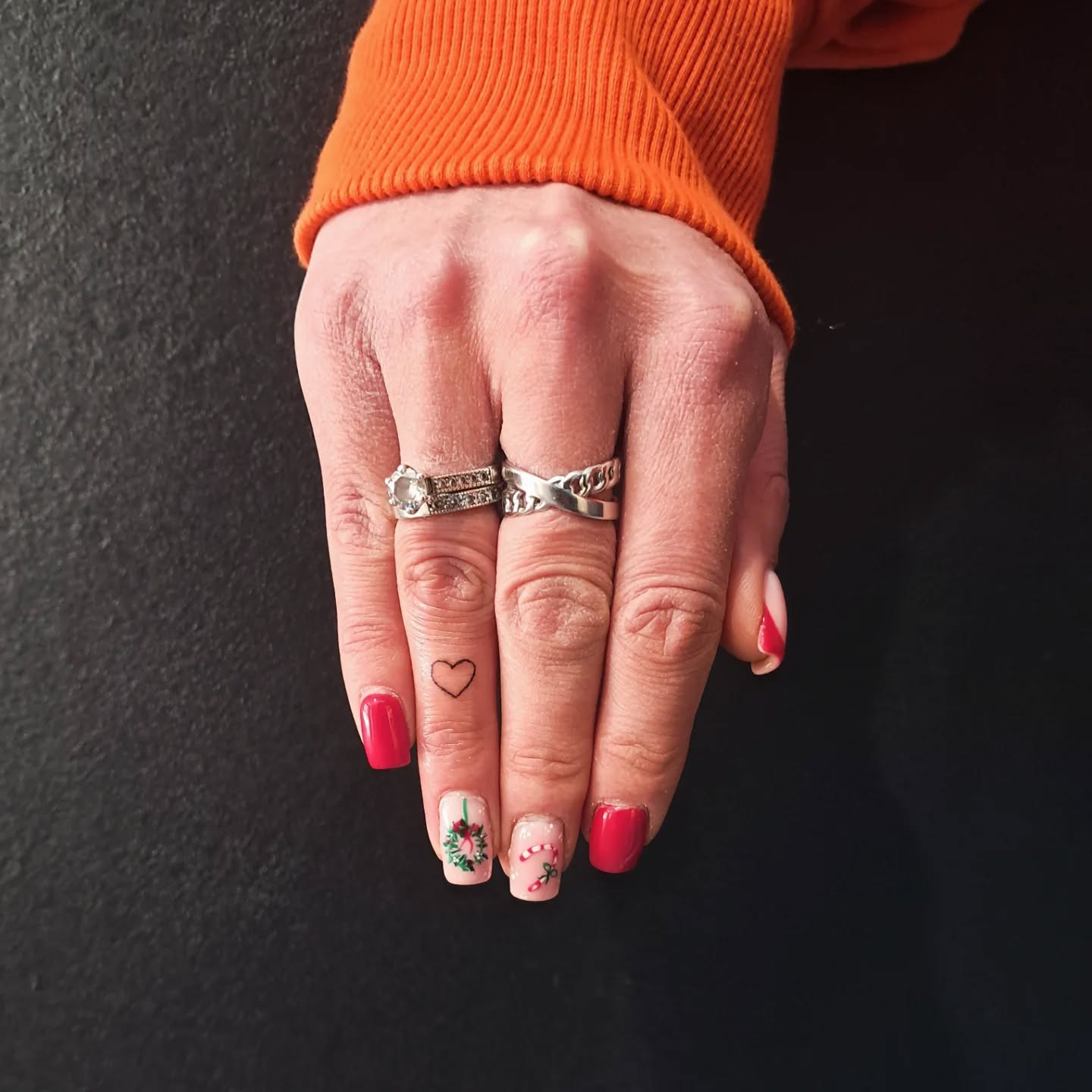 This image showcases a beautiful hand adorned with a delicate heart tattoo nestled among vibrant nail art. The combination of the simple ink design and the festive nail decorations creates a playful yet elegant look. A small tattoo like this can be a lovely way to express one’s personality without overwhelming the overall style.