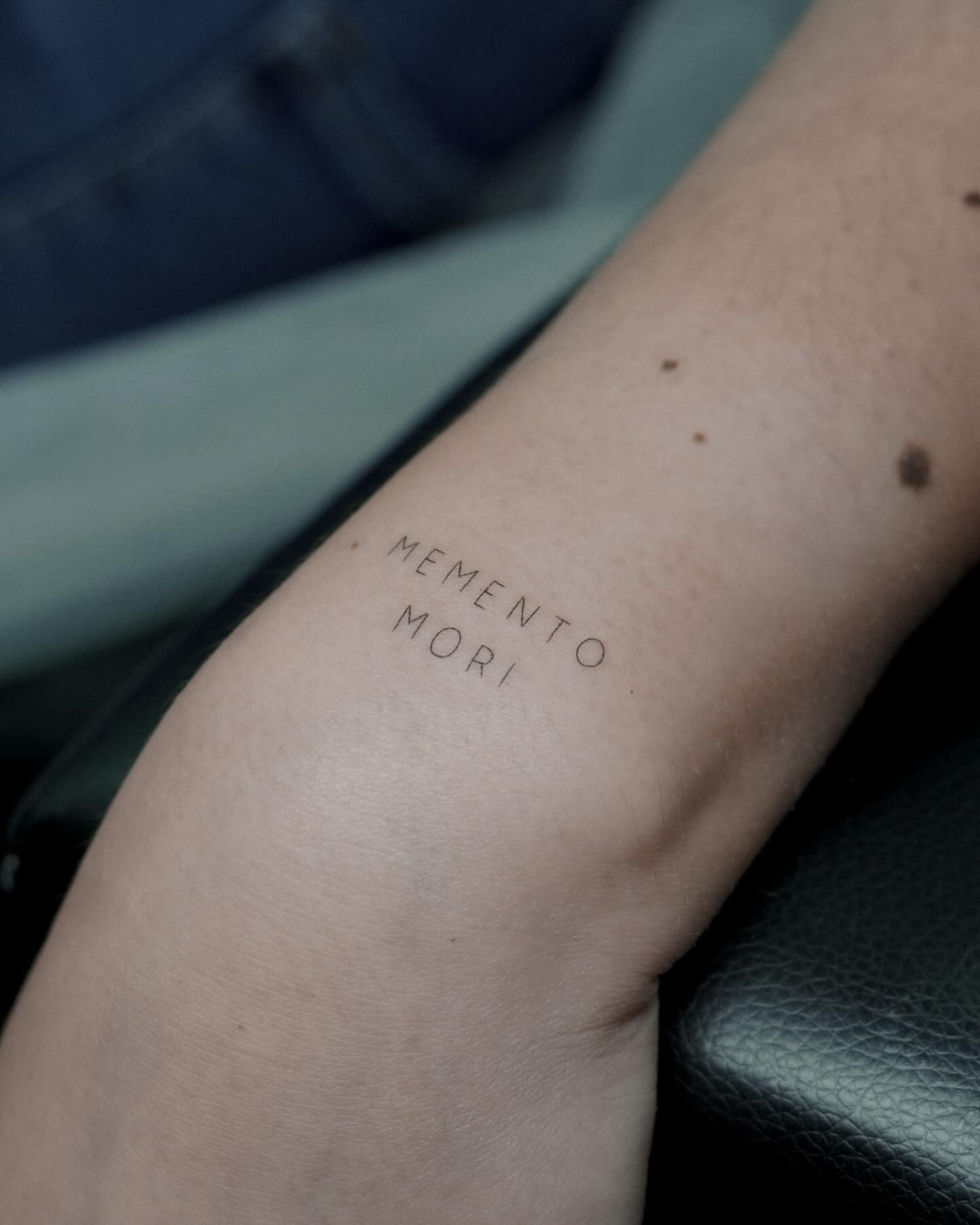 This tattoo features the phrase “Memento Mori,” a beautiful reminder to cherish every moment. Such meaningful ink can spark conversations and inspire a deeper appreciation for life. Choosing a fine tattoo like this not only reflects personal beliefs but also adds a touch of elegance to one’s style.
