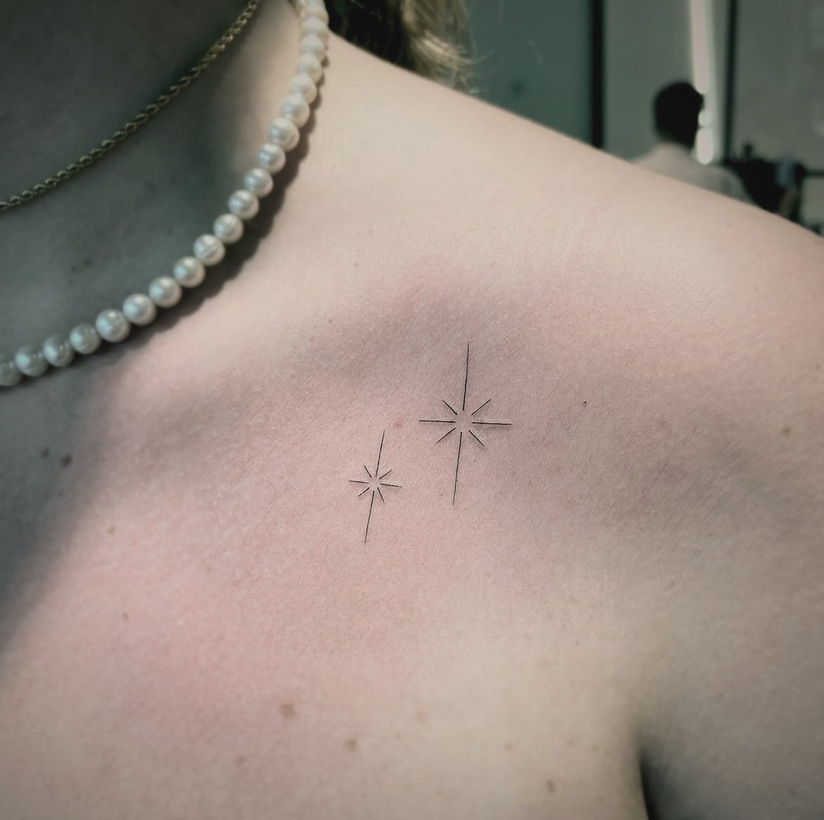 This image showcases two delicate star tattoos that glimmer softly on the shoulder, creating an enchanting look. The fine lines and minimalist design make these tattoos both stylish and meaningful, symbolizing guidance and dreams. For those considering their first tattoo, starting with a simple and elegant design can be a wonderful choice.