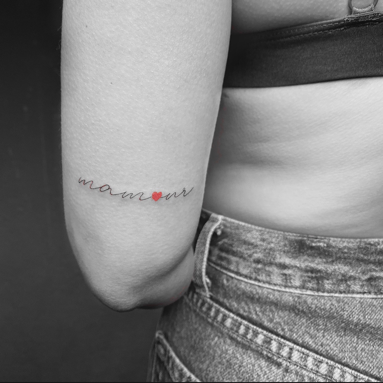 This tattoo features the word “amour” elegantly written with a small red heart, making it a lovely tribute to love. The delicate script stands out beautifully against the skin, creating a personal touch that many women cherish. Choosing a meaningful word can make a tattoo even more special, reminding wearers of what matters most to them.