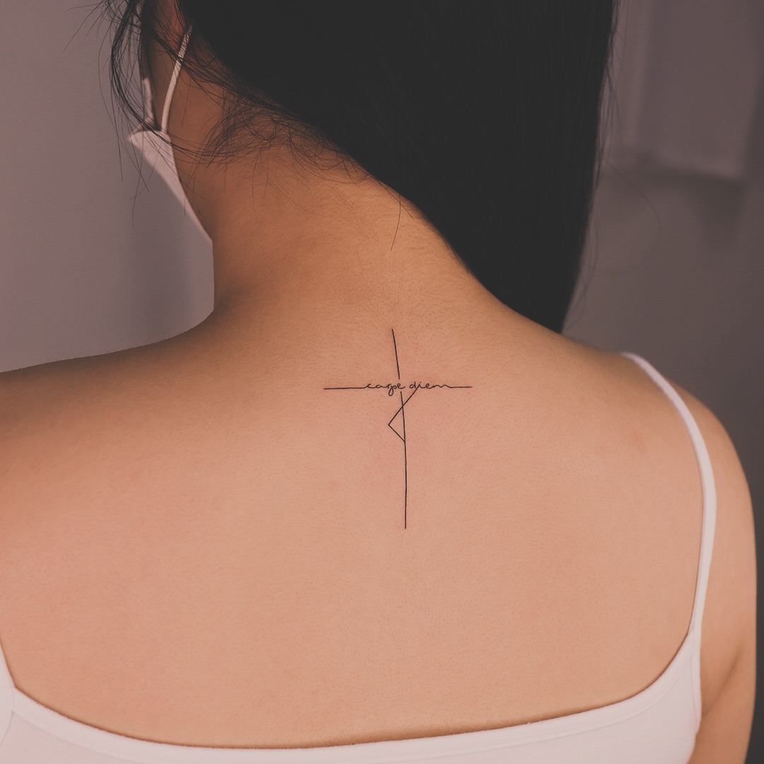 This tattoo showcases a beautiful blend of simplicity and meaning, featuring delicate lines that create a striking design on the back. The unique combination of geometric shapes and the word “enjoy” adds a personal touch, making it not just a tattoo, but a statement of positivity. For those considering fine tattoos, choosing a design that resonates personally can enhance its significance.