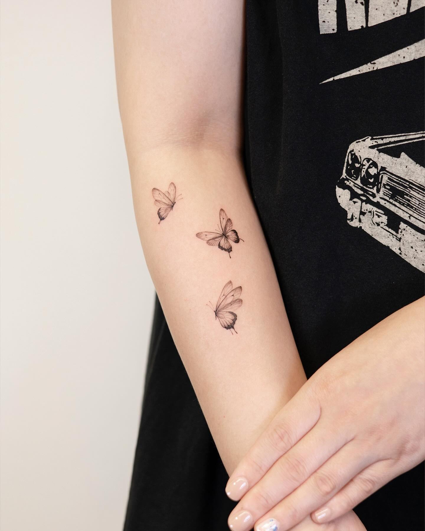 This image showcases a delicate arrangement of butterfly tattoos on a woman’s arm, capturing the beauty and grace of these creatures. Each butterfly appears to flutter gently, adding a touch of whimsy and elegance to her look. Choosing fine tattoos like these can symbolize transformation and freedom, making them a meaningful choice for anyone looking to express their individuality.