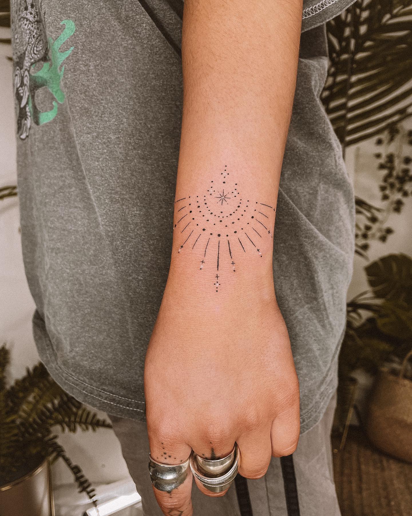 This delicate starburst tattoo on the hand is a delightful expression of personal style. Its simple yet striking design adds a touch of charm to the wearer, making it a perfect choice for those who appreciate understated elegance. When selecting fine tattoos, consider placements that highlight your natural beauty, just like this one does!