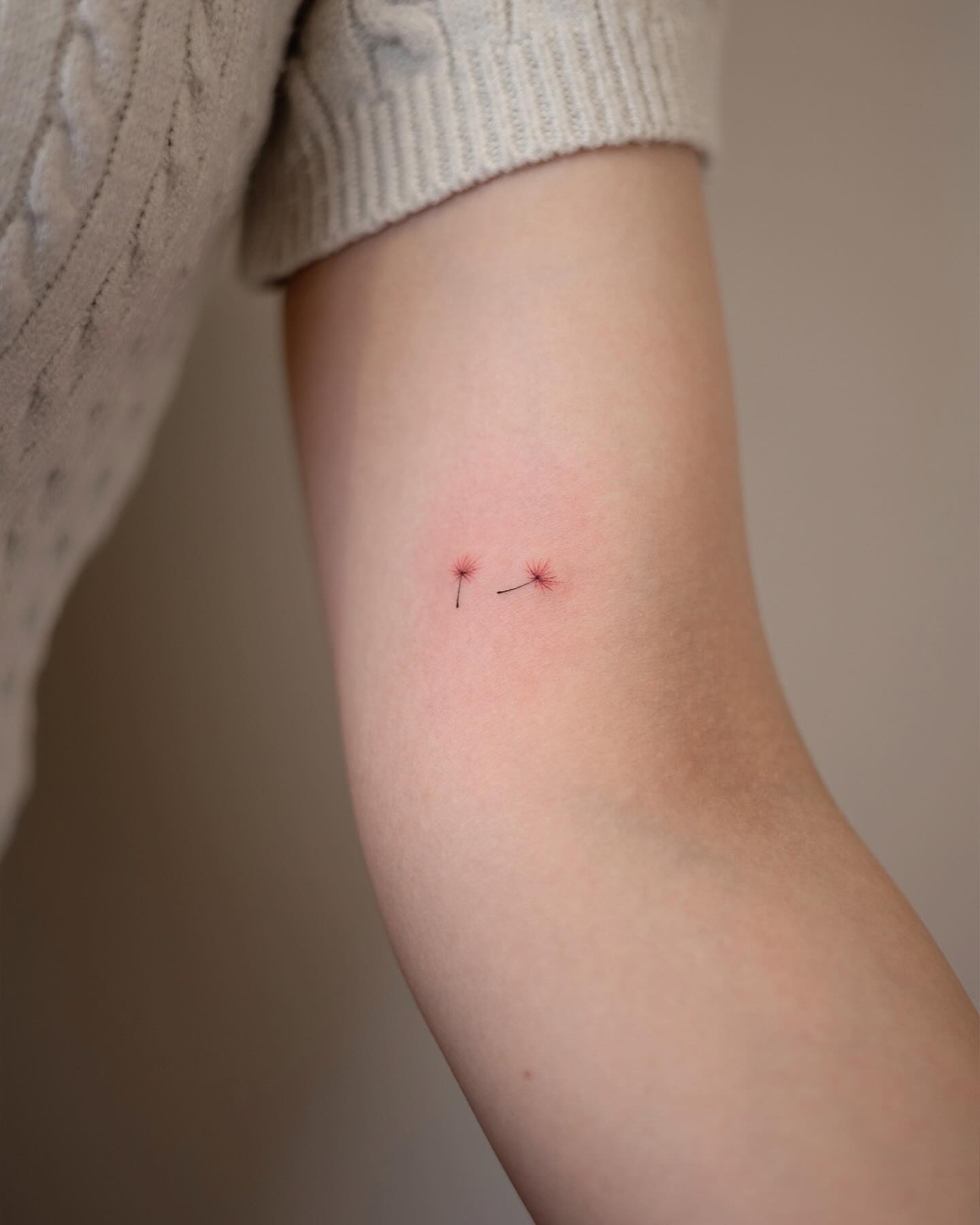 This tattoo showcases delicate dandelion seeds, perfectly inked to capture a moment of whimsy and beauty. The soft pink hues contrast beautifully against the skin, creating a charming visual that feels both light and airy. For those considering fine tattoos, choosing designs that resonate personally can make the experience even more special.