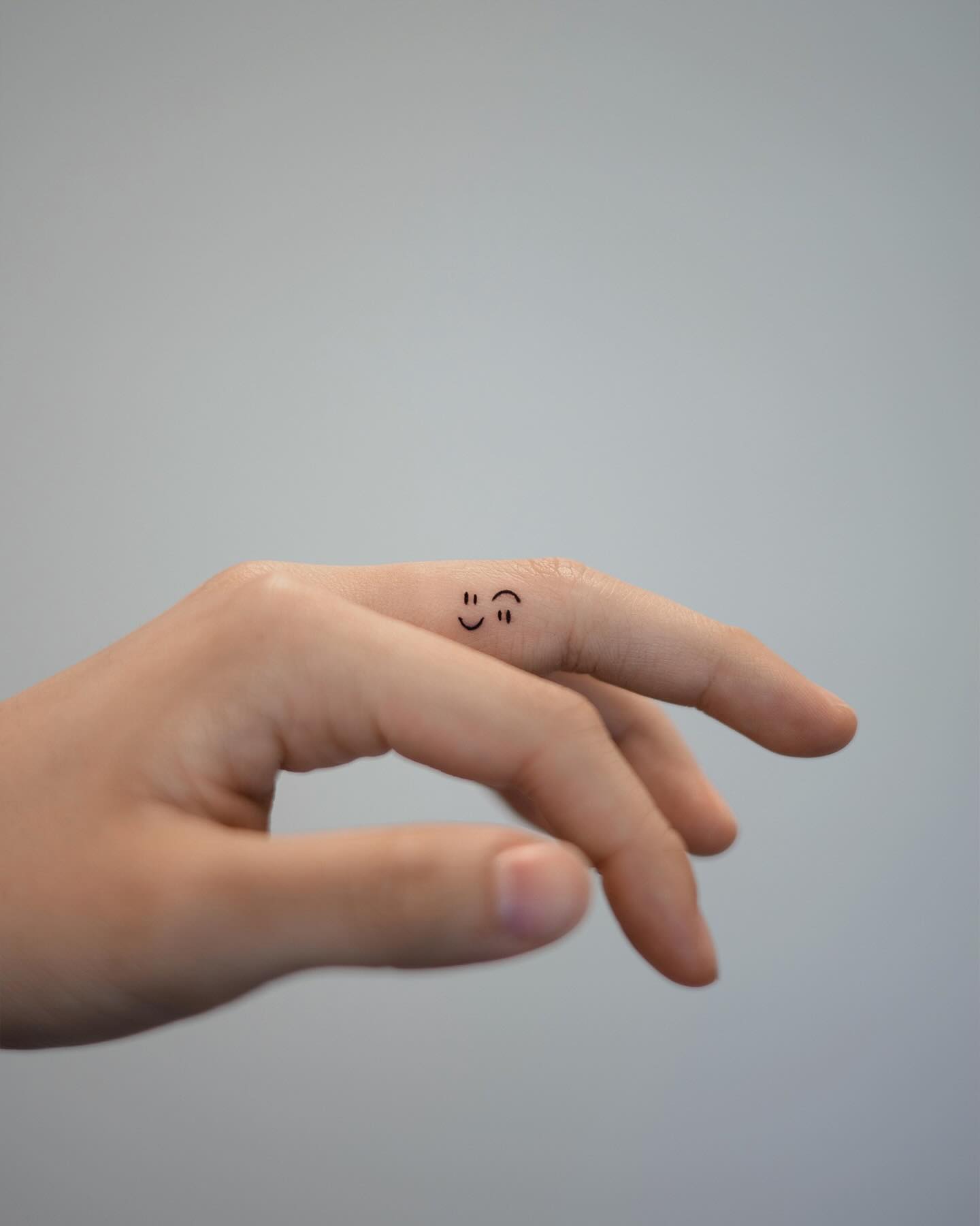 This delightful tattoo of a smiling face on a fingertip brings a touch of whimsy to everyday moments. Its small size makes it a subtle yet fun choice, perfect for those who appreciate creativity in their body art. For anyone considering fine tattoos, remember that sometimes, less is more, and a tiny design can pack a big punch!