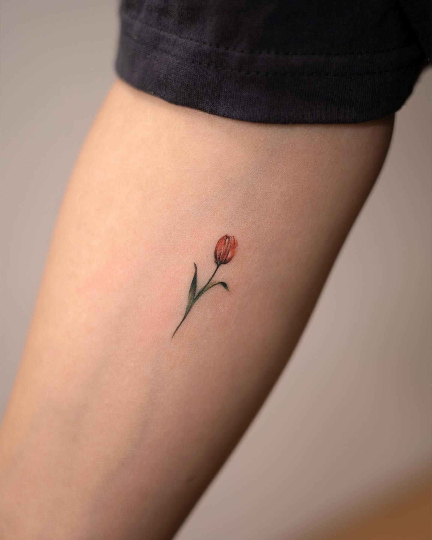 This lovely tattoo features a delicate tulip that stands out with its vibrant colors and fine details. The graceful design captures the beauty of nature, symbolizing love and renewal. Choosing such a charming piece can be a wonderful way for women to express their individuality while celebrating the simple joys of life.