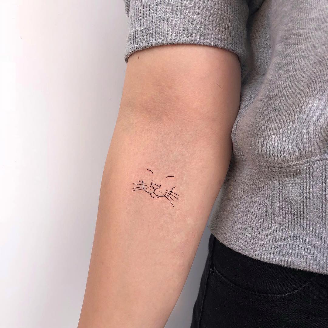 This delightful tattoo showcases a simple yet adorable cat face, capturing a moment of pure charm. The delicate lines and minimalistic design make it a perfect choice for anyone wanting to express their love for pets in a unique way. Choosing fine tattoos like this can add a touch of personality while keeping the look sleek and stylish.