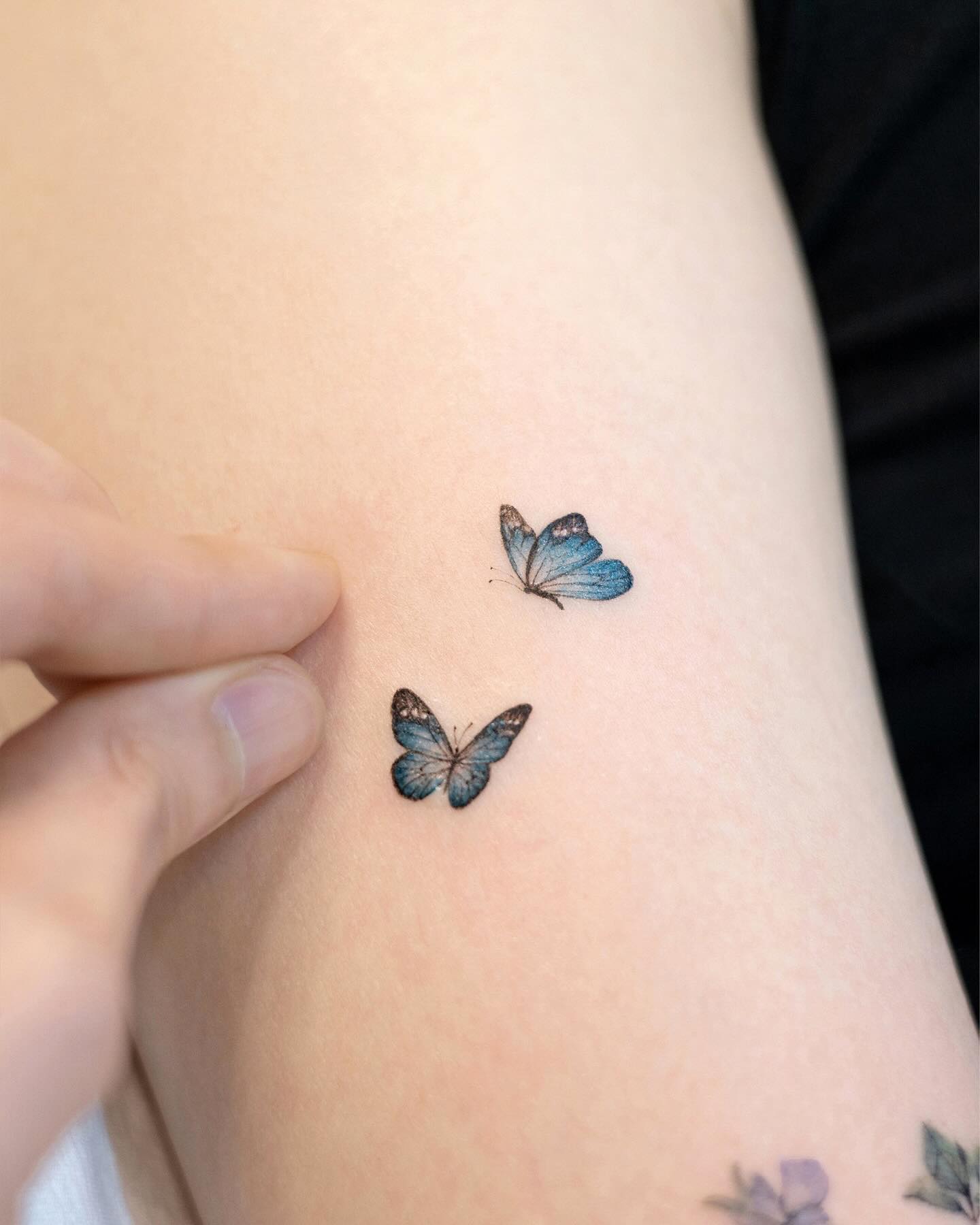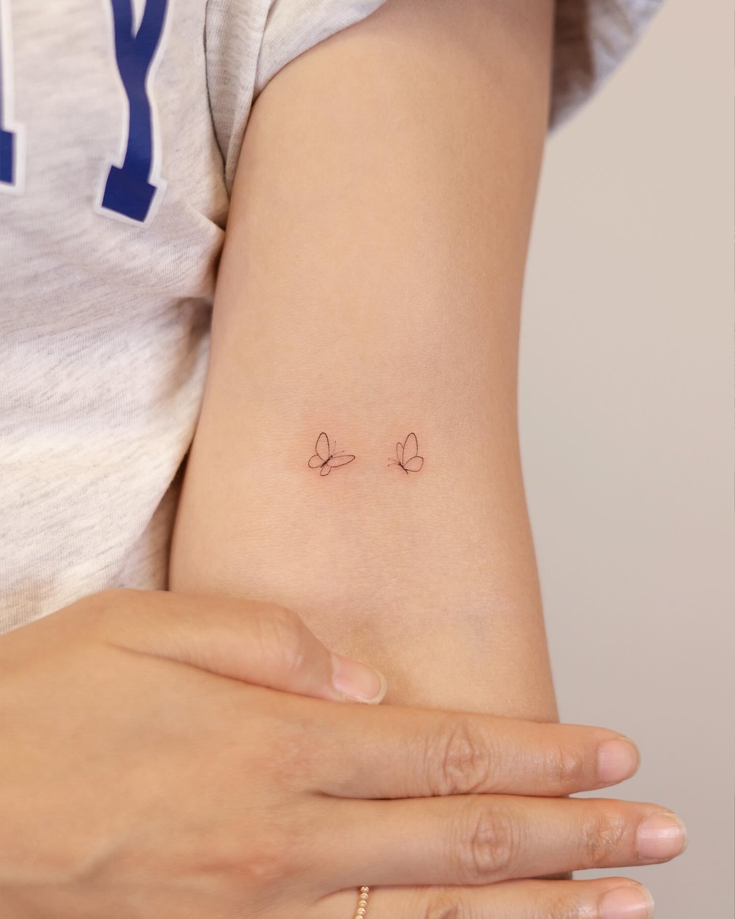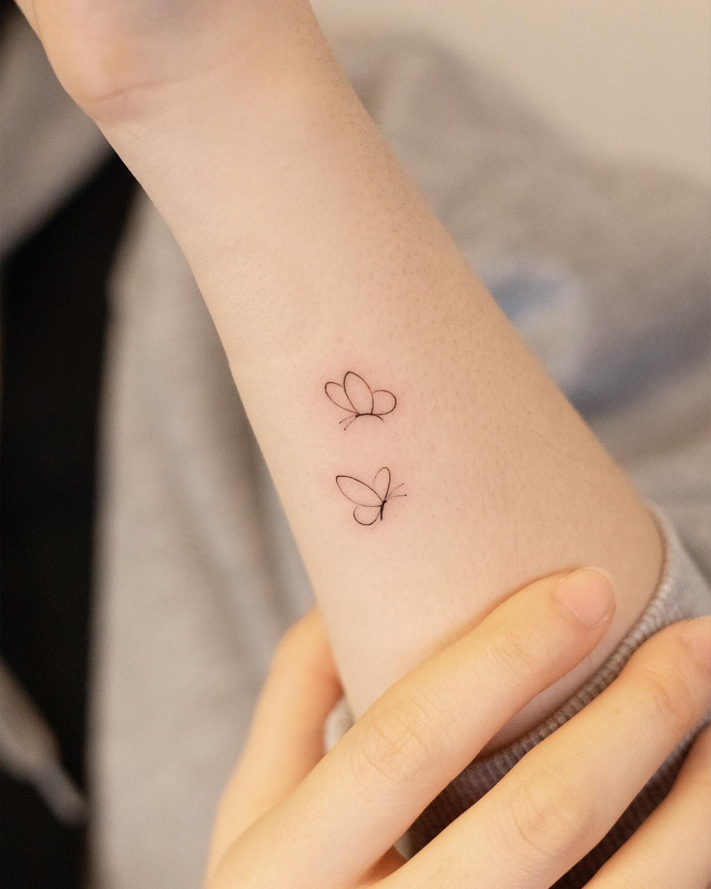 This image showcases two delicate butterfly tattoos, each finely detailed and gracefully placed on the arm. The gentle lines and subtle design reflect a sense of freedom and transformation, making them a perfect choice for anyone who loves nature. Choosing a small tattoo like this can be a beautiful way to express individuality without overwhelming the skin.