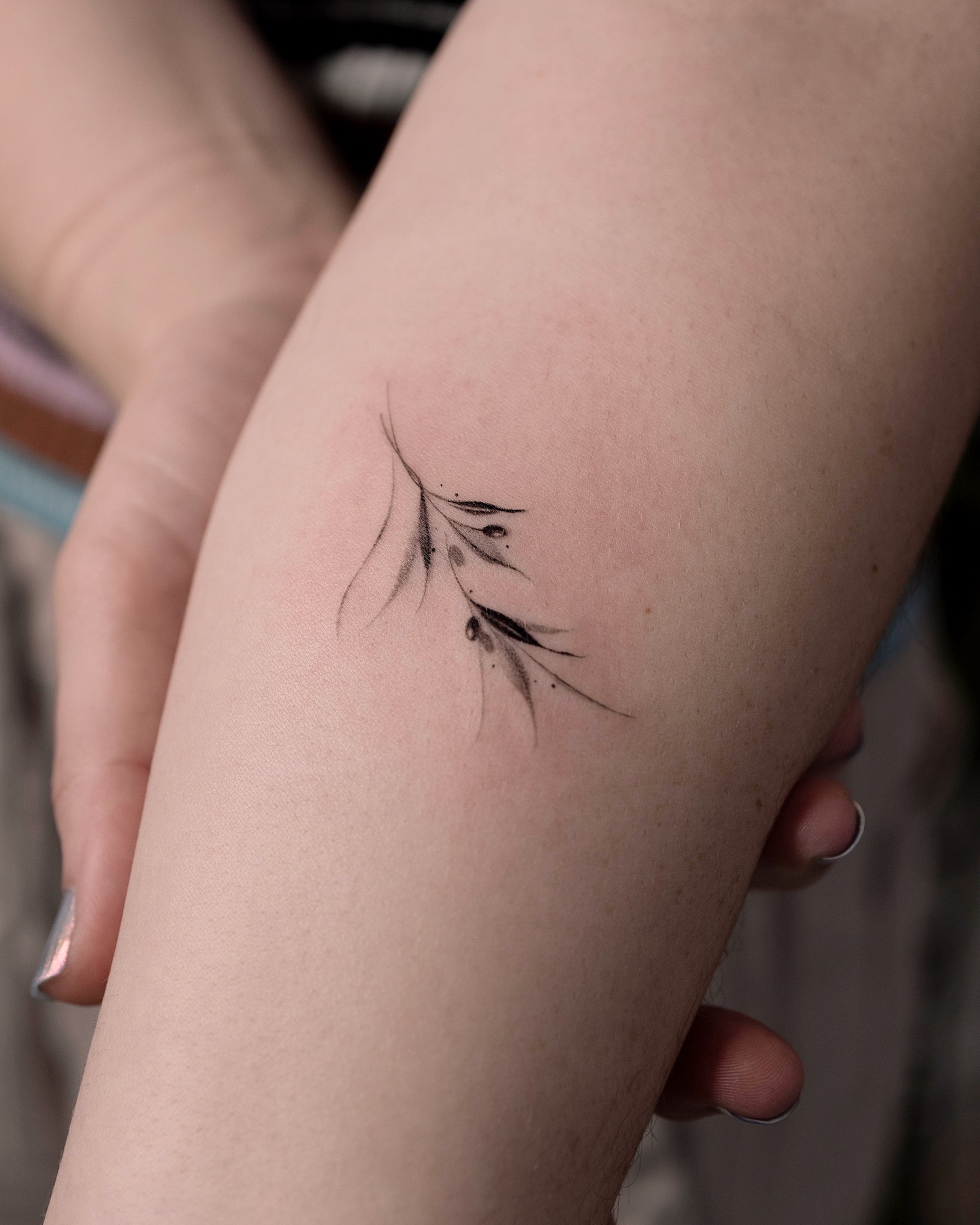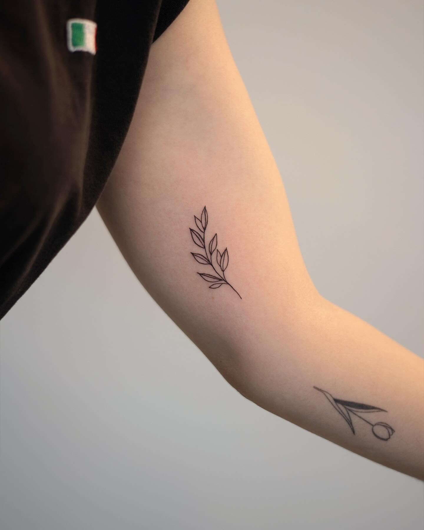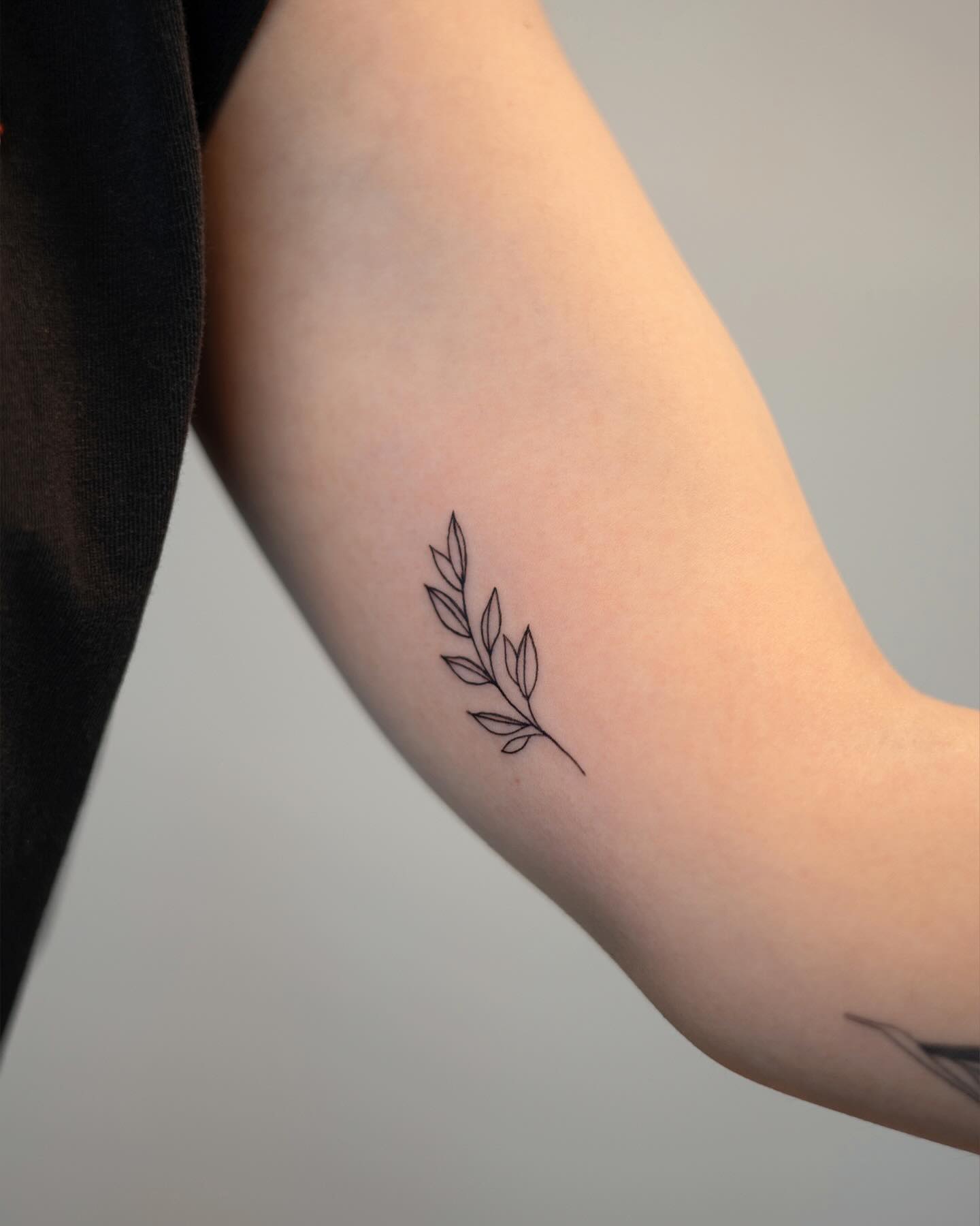 This tattoo features a charming leaf design that adds a touch of nature to the arm. Its simple lines and delicate shape make it a beautiful choice for anyone looking for a subtle yet stylish statement. Choosing a fine tattoo like this can be a lovely way to express individuality and connect with the beauty of the natural world.