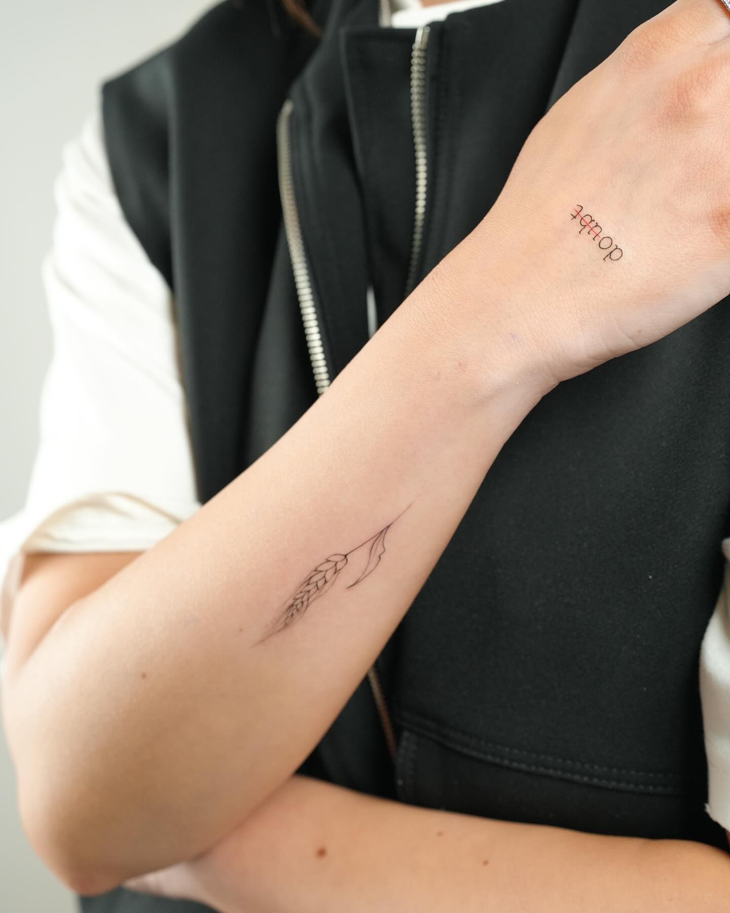 This image showcases a beautifully delicate tattoo of a wheat stalk, highlighting the elegance of nature in body art. The fine lines and subtle design create a soft, inviting look that speaks to a love for simplicity and beauty. For those considering a tattoo, choosing a design that resonates personally can make it even more special.