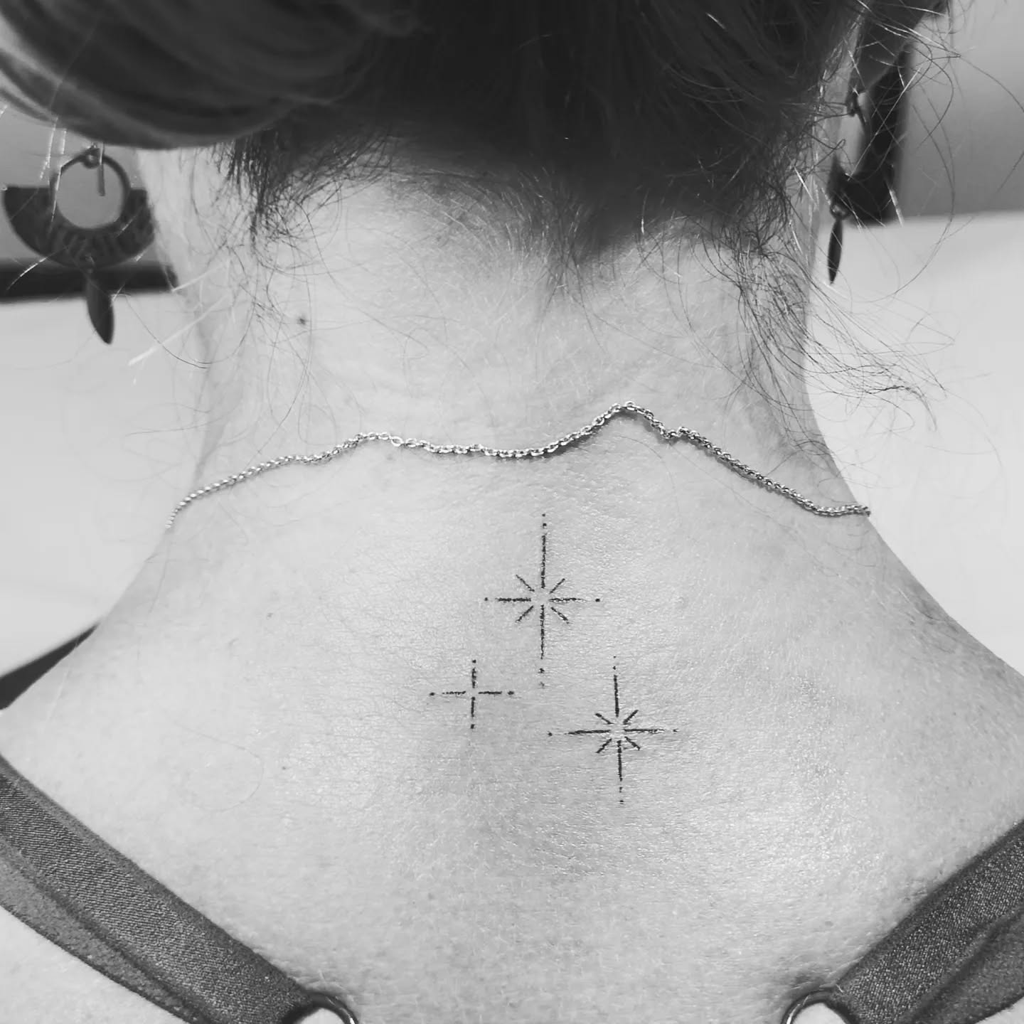 This tattoo showcases delicate star designs that beautifully adorn the nape of the neck, creating a charming look. The simplicity of the stars, paired with the elegant chain necklace, adds a touch of sophistication and whimsy. For those considering fine tattoos, choosing a design that reflects personal meaning can make it even more special.