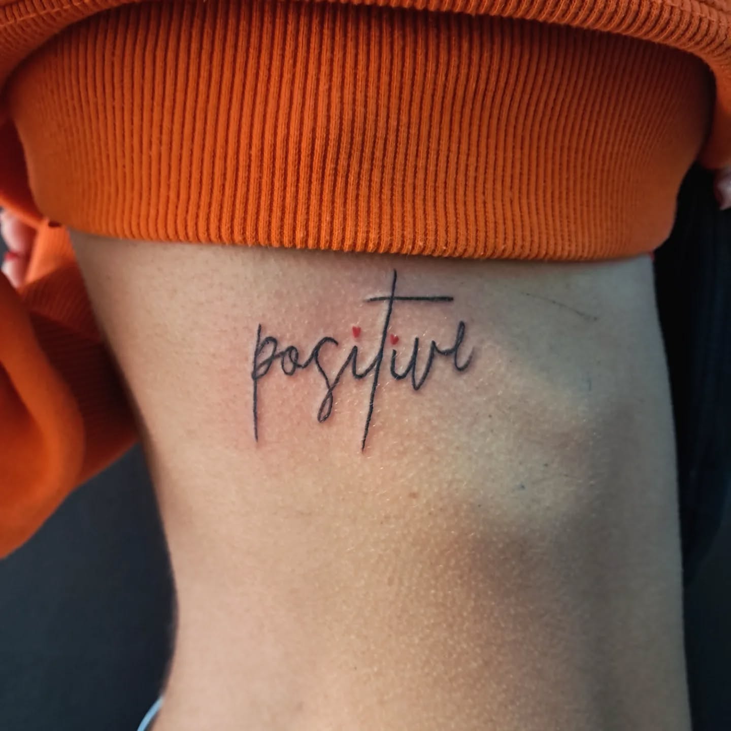 This tattoo beautifully showcases the word “positive,” written in a stylish and delicate font. The gentle curves and small hearts add a personal touch, making it more than just a word it’s a statement of joy. For anyone considering fine tattoos, choosing a meaningful word can serve as a daily reminder to stay optimistic.