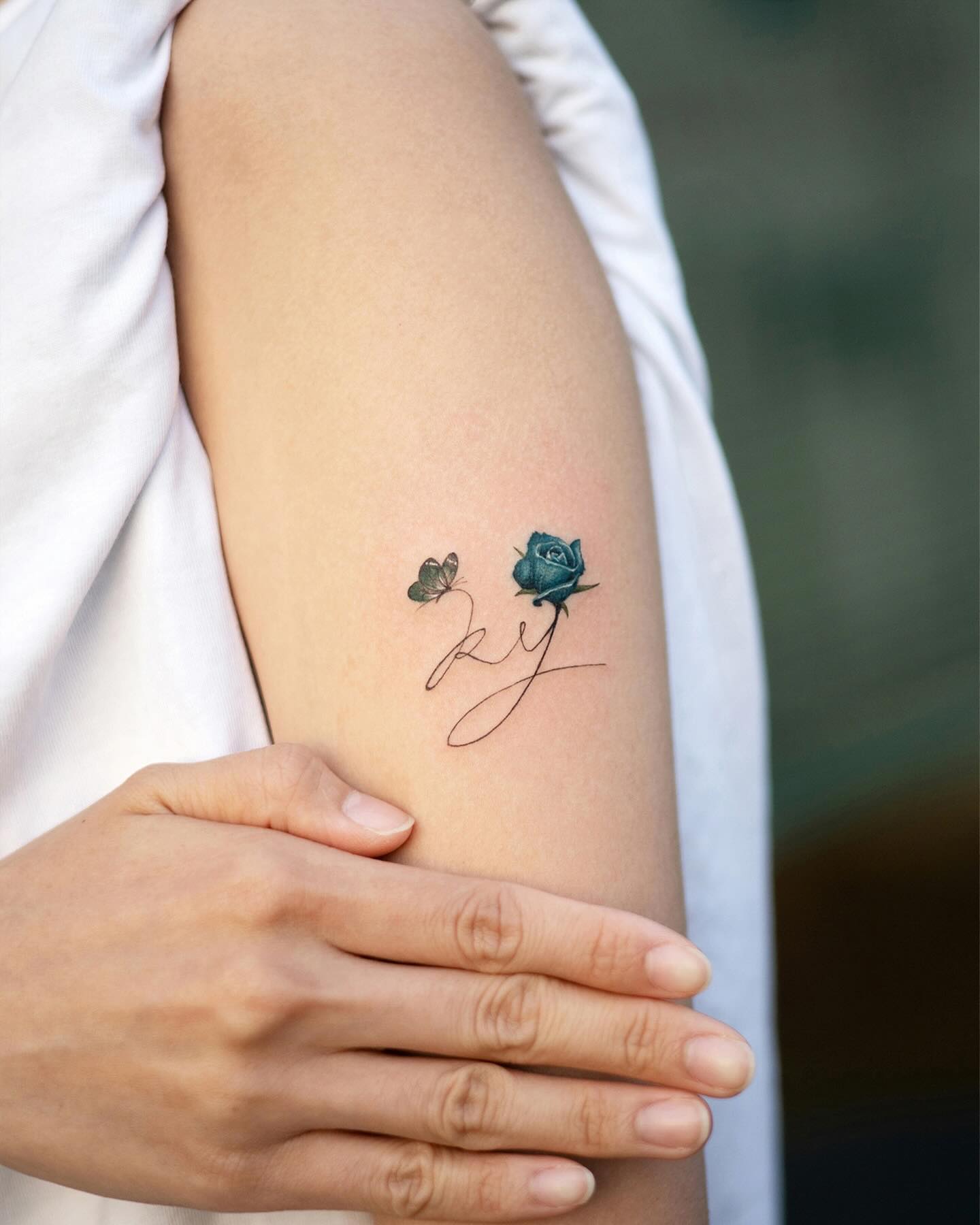 This tattoo showcases a stunning blue rose paired with a delicate butterfly, creating a beautiful blend of nature’s artistry. The soft colors and graceful lines make it a perfect choice for someone wanting a refined and meaningful design. When choosing a tattoo, consider how the colors and shapes reflect your personality and values, just like this captivating piece.