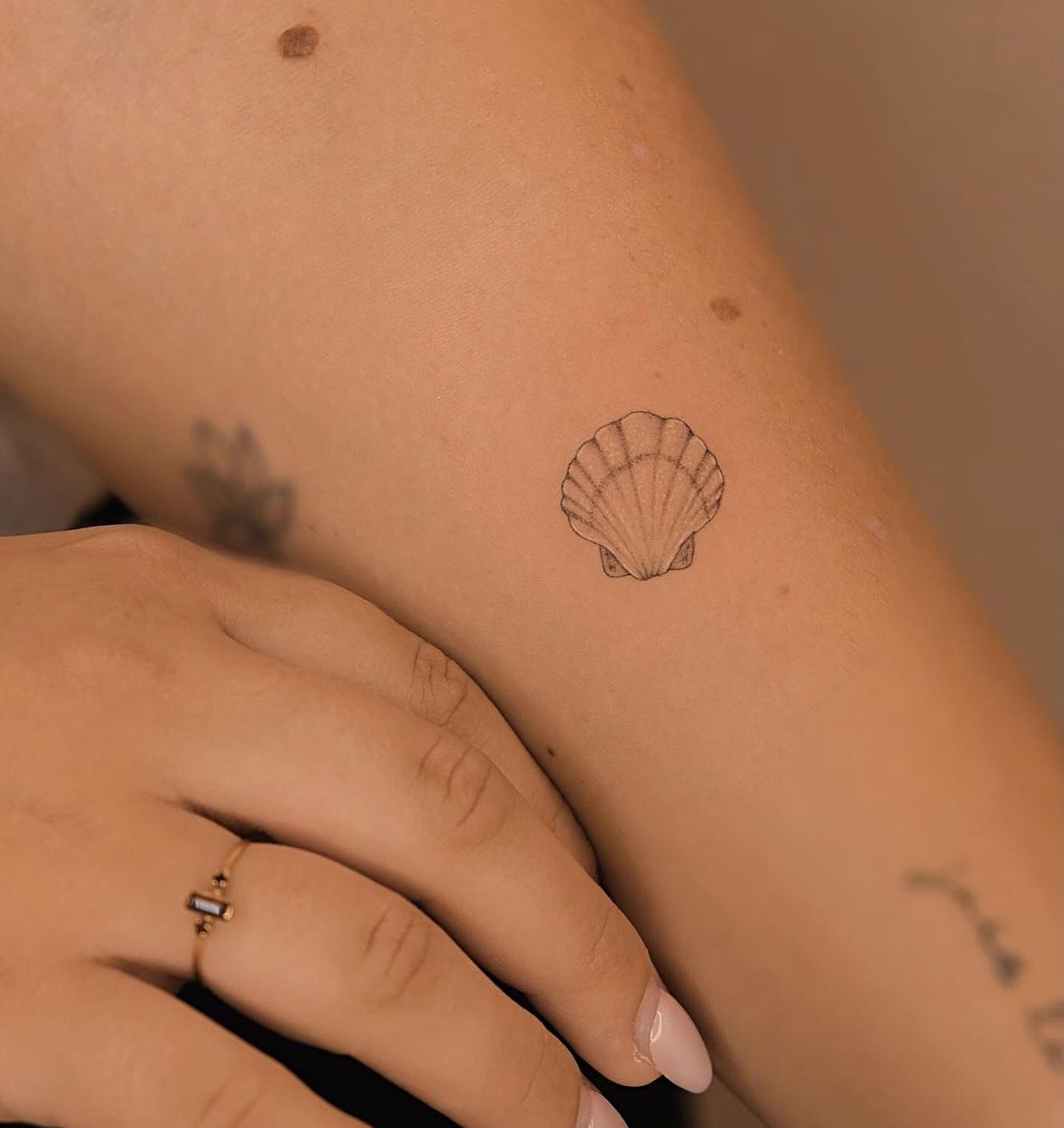 This delightful tattoo features a delicate shell design, perfectly inked on the arm. Its subtle beauty captures the essence of the ocean, making it a charming choice for those who love the sea. A small tattoo like this can be a wonderful way to express personal interests or memories without overwhelming the skin.