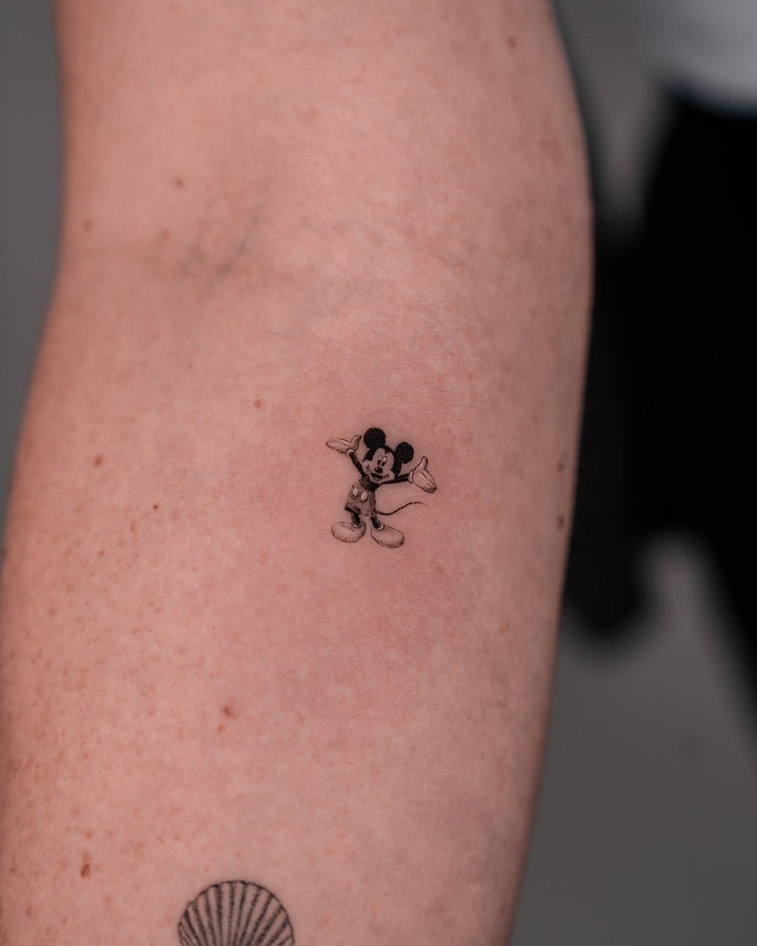This charming tattoo features a playful Mickey Mouse, capturing the joy of childhood memories. Its fine lines and detailed design make it a perfect choice for those who appreciate a whimsical touch in their body art. Choosing a tattoo that reflects personal stories can make it even more special and meaningful.