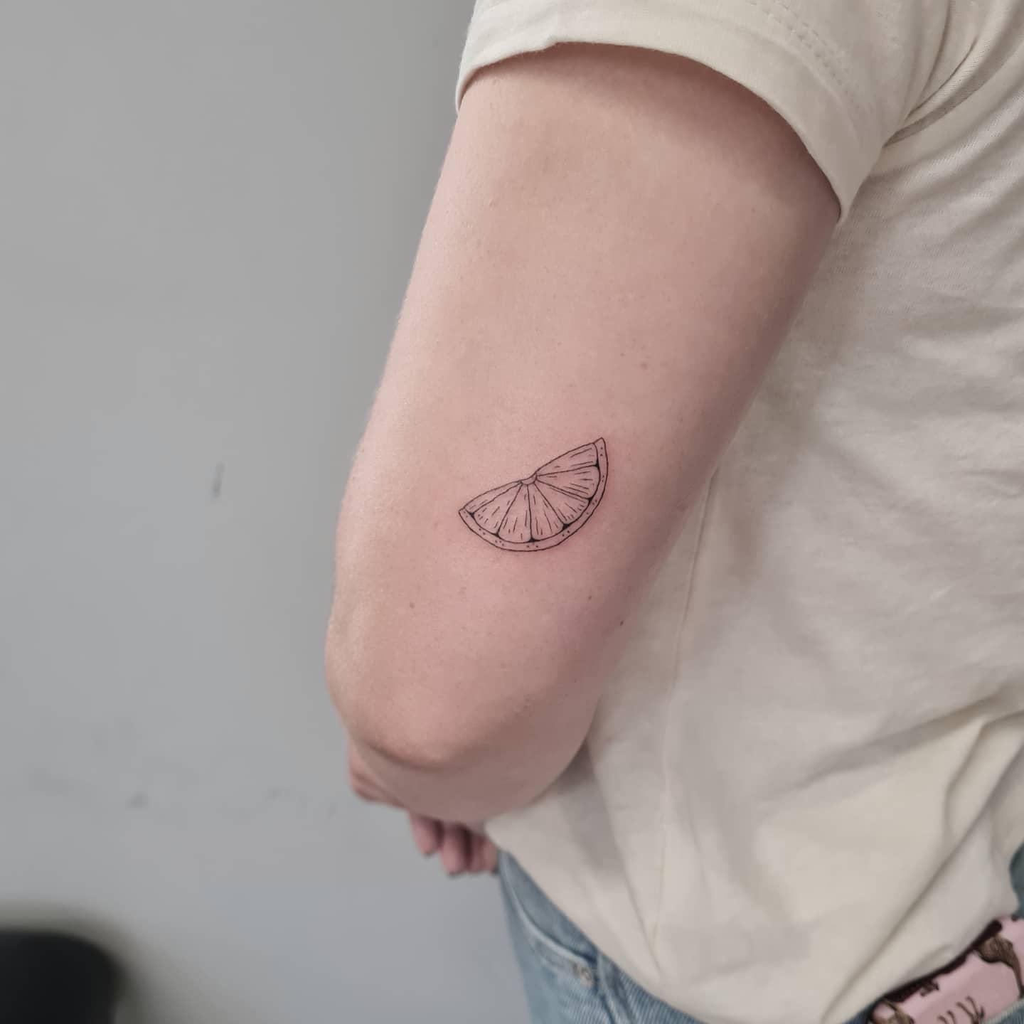 This charming tattoo of a citrus slice brings a refreshing touch to body art. Its delicate design captures the juicy essence of summer, reminding everyone of sunny days and sweet moments. Choosing fine tattoos like this can be a fun way to express personality while keeping it light and playful.