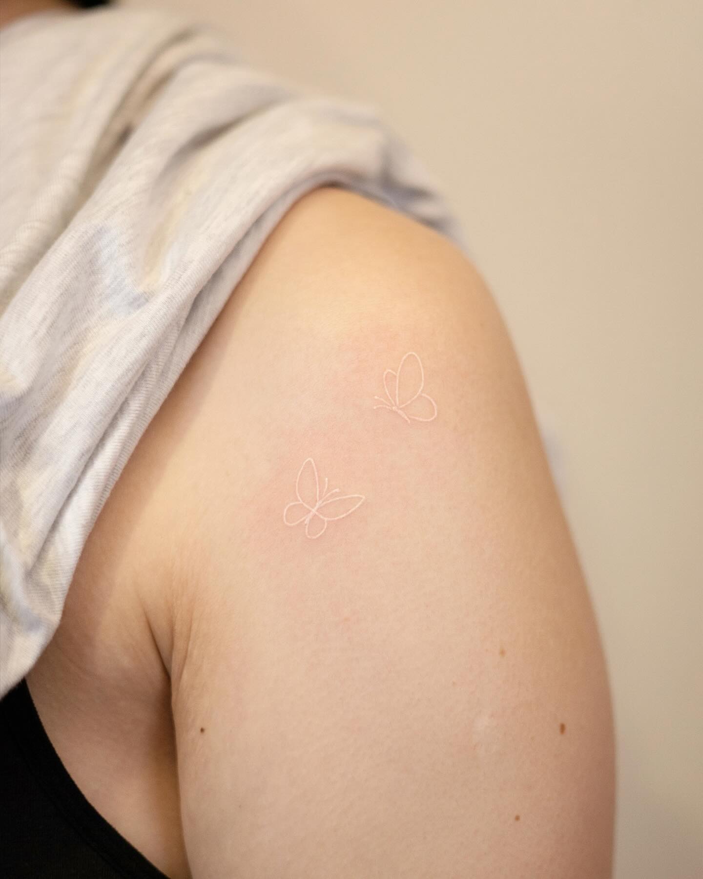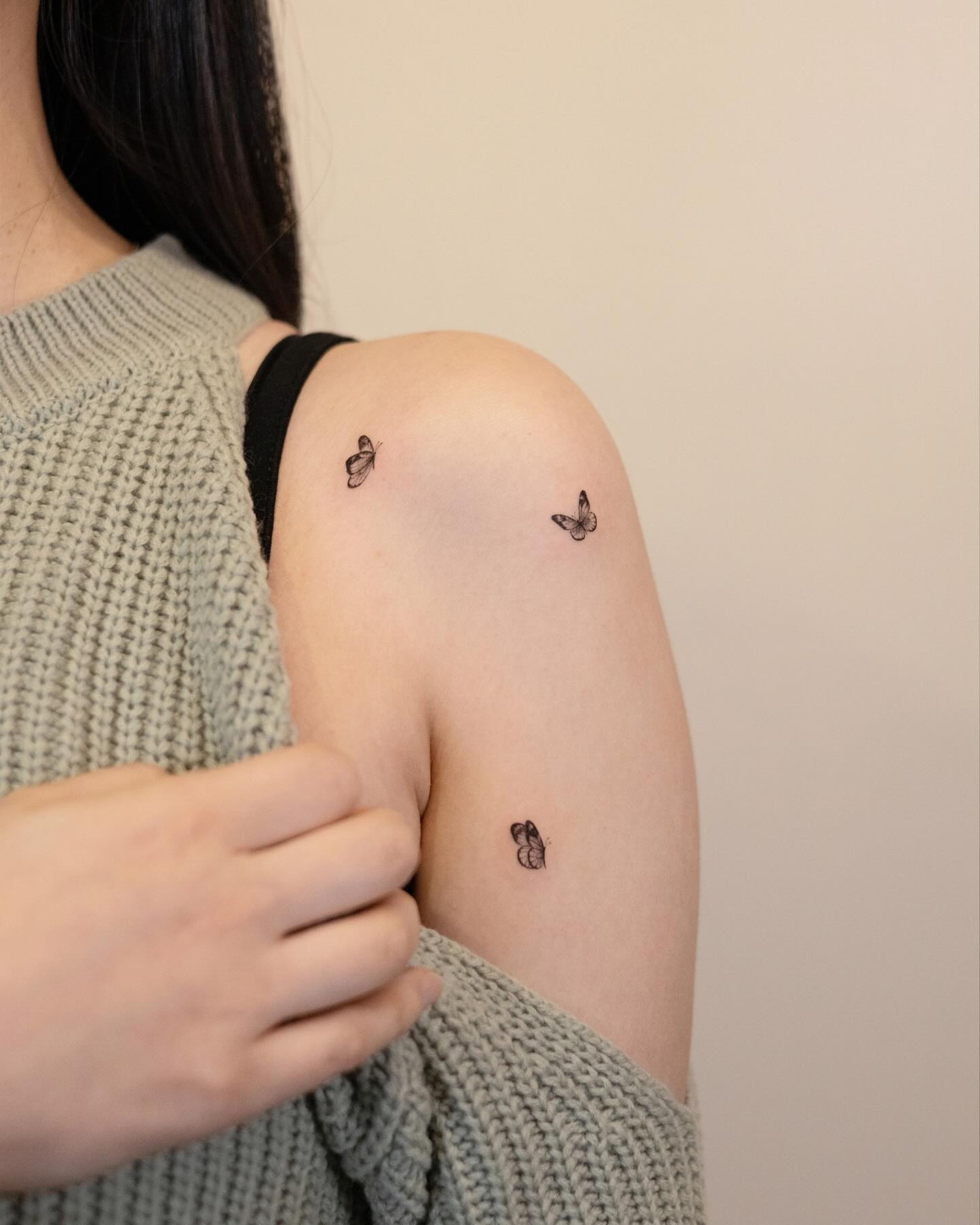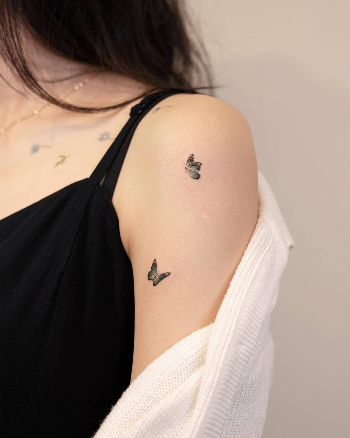 This image showcases delicate butterfly tattoos that add a touch of charm to the shoulder. The soft, light design creates a beautiful contrast against the skin, making it a perfect choice for those who appreciate subtle art. For anyone considering fine tattoos, choosing a design that resonates personally can make the experience even more special.