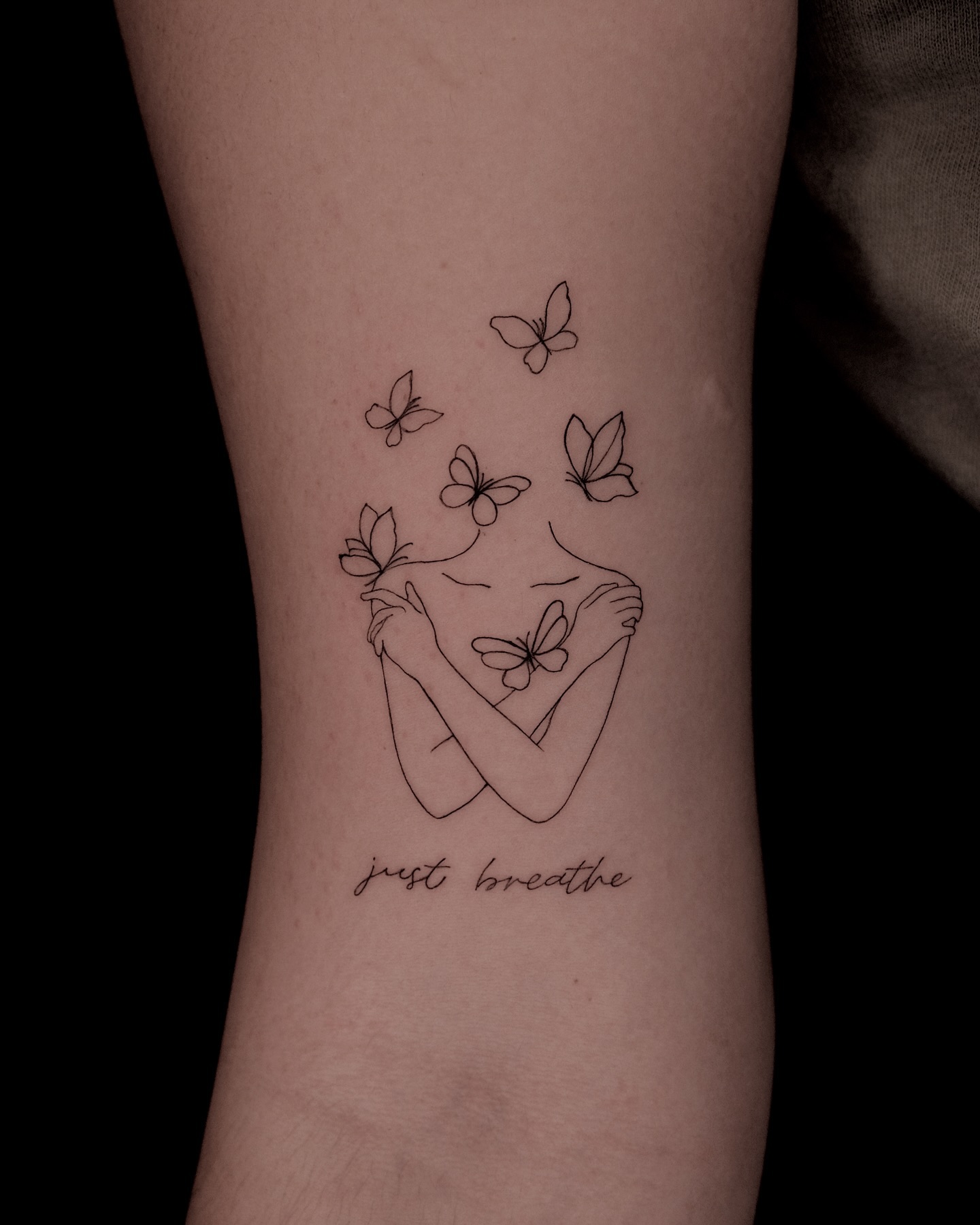 This tattoo beautifully captures the essence of freedom and tranquility with its delicate design of butterflies surrounding a figure in an embracing pose. The phrase “just breathe” adds a calming touch, reminding viewers to take a moment for themselves. For those considering fine tattoos, choosing symbols that resonate personally can make the art even more meaningful.
