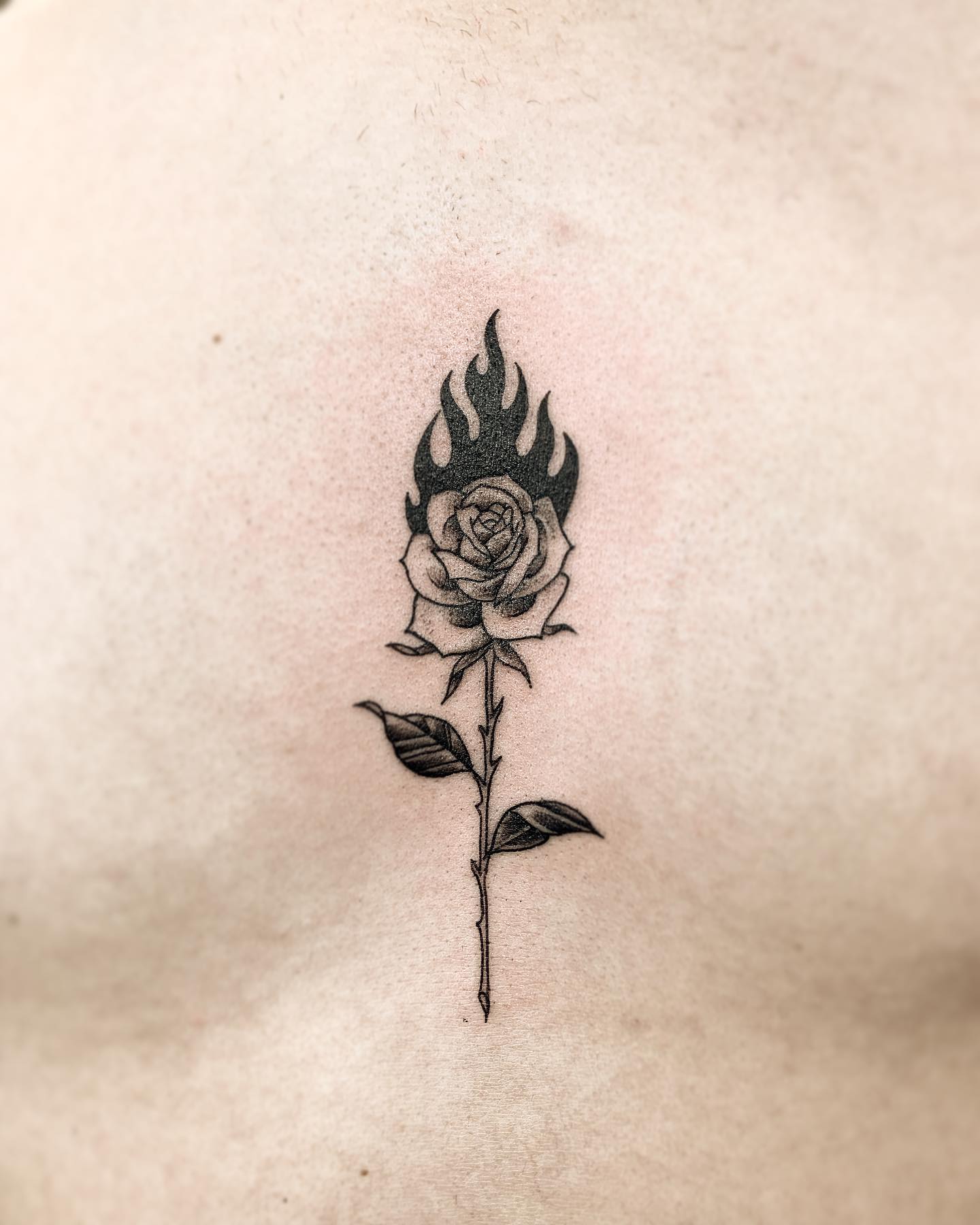 This tattoo combines the beauty of a rose with the fierce energy of flames, creating a striking visual impact. The delicate details of the flower contrast beautifully with the boldness of the flames, symbolizing strength and grace. Choosing such a design can make a powerful statement about embracing both softness and resilience in life.