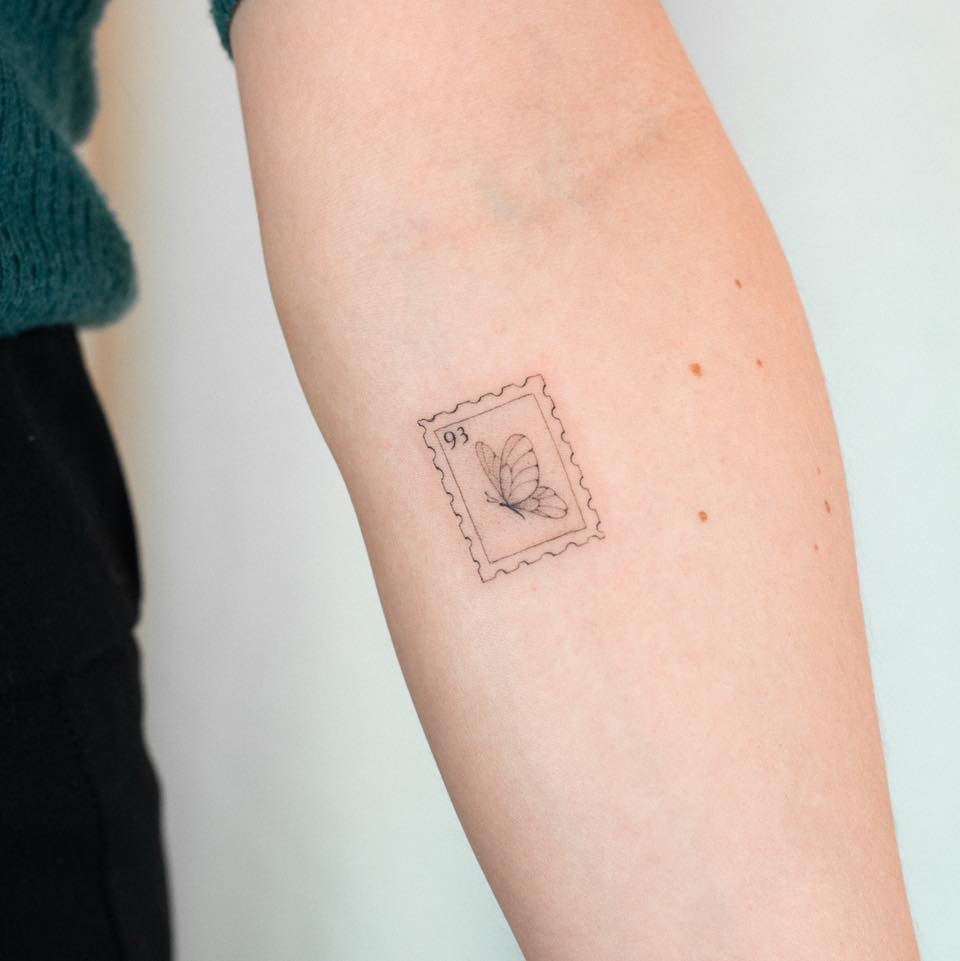 This tattoo features a delicate design resembling a vintage postage stamp, complete with a beautifully drawn butterfly inside. The intricate details and soft lines create a charming look that s both unique and meaningful. For those considering fine tattoos, choosing a design that tells a personal story can make it even more special.