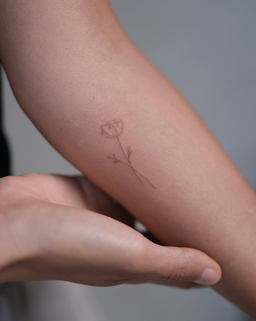 This image showcases a delicate tattoo of a single flower, beautifully etched on a woman’s arm. The fine lines and soft details create an elegant look that symbolizes grace. A great tip for choosing a tattoo like this is to select a design that holds personal meaning, making it a unique expression of one s style.