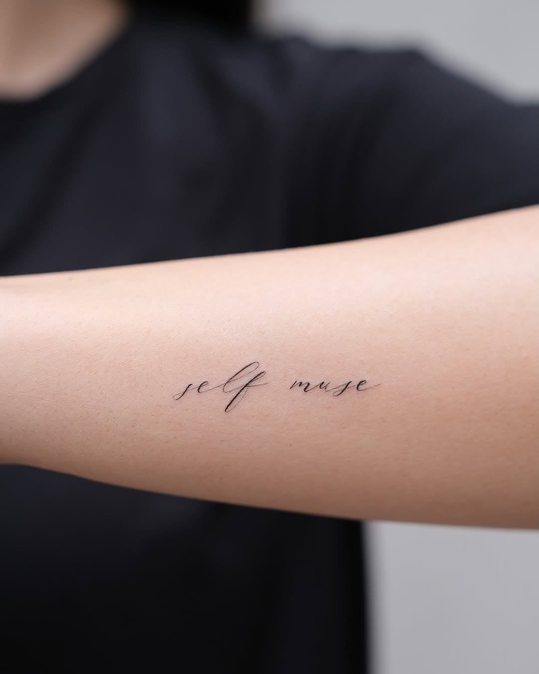 This tattoo beautifully showcases the phrase “self muse,” flowing elegantly across the wearer s forearm. The delicate script not only adds a touch of sophistication but also serves as a reminder to embrace one s creativity and individuality. For those considering fine tattoos, choosing meaningful words can make the art even more personal and impactful.