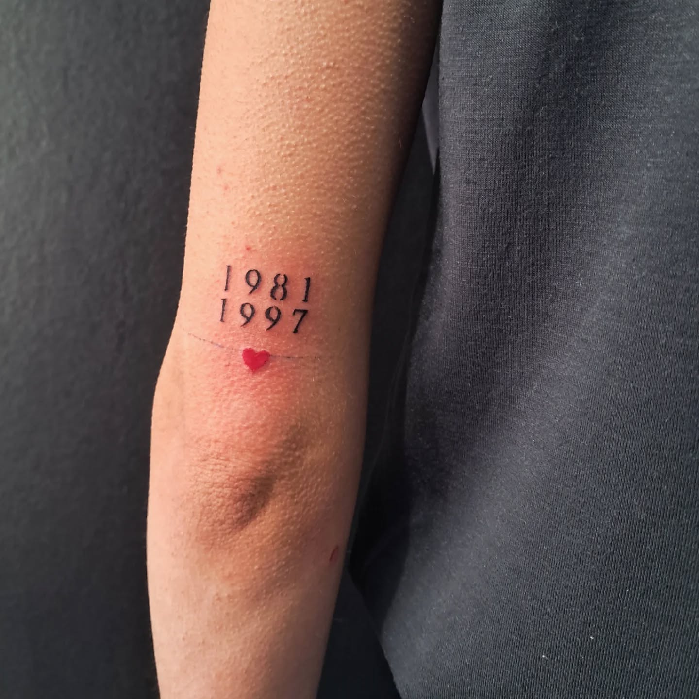 This tattoo beautifully combines numbers with a small red heart, creating a poignant reminder of cherished moments. The years 1981 and 1997 suggest significant life events, celebrating love and remembrance in a simple yet elegant way. For those considering a personal tattoo, it s a lovely idea to incorporate meaningful dates that tell your unique story.