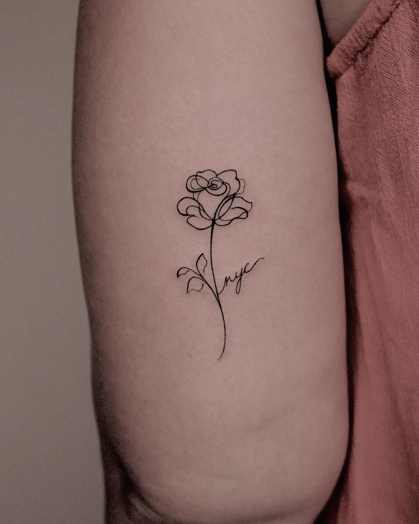 This tattoo beautifully captures the delicate charm of a single rose, showcasing fine lines that create a graceful design. The addition of a handwritten word adds a personal touch, making it not just art, but a meaningful statement. Choosing simple yet elegant tattoos like this one can be a great way for women to express their individuality without overwhelming their style.