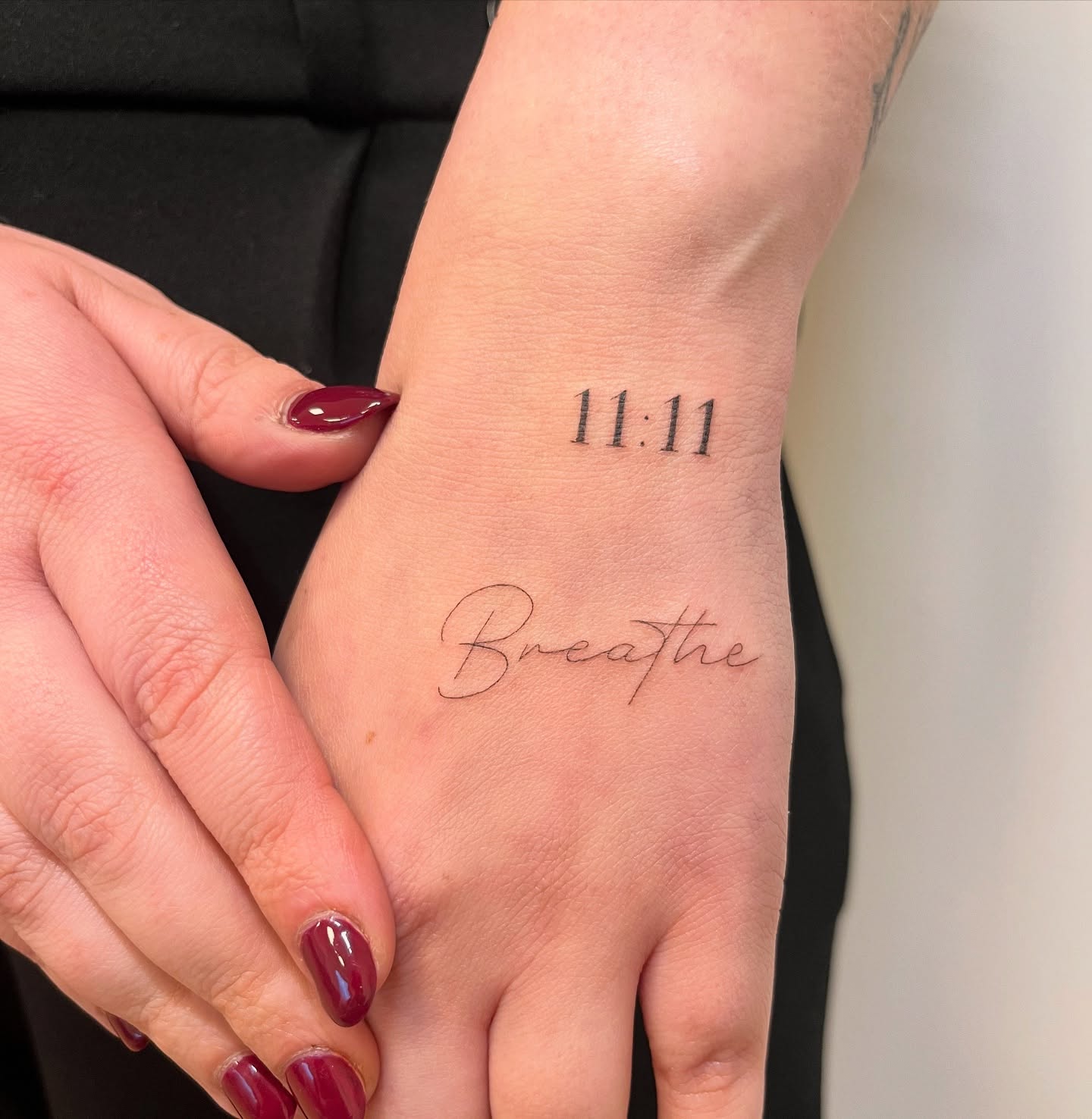 This lovely tattoo features the meaningful numbers “11:11” alongside the word “Breathe,” creating a gentle reminder to pause and reflect. The clean lines and elegant script make it a perfect choice for those who appreciate subtle yet impactful designs. Choosing a meaningful message can turn a simple tattoo into a personal mantra for daily life.