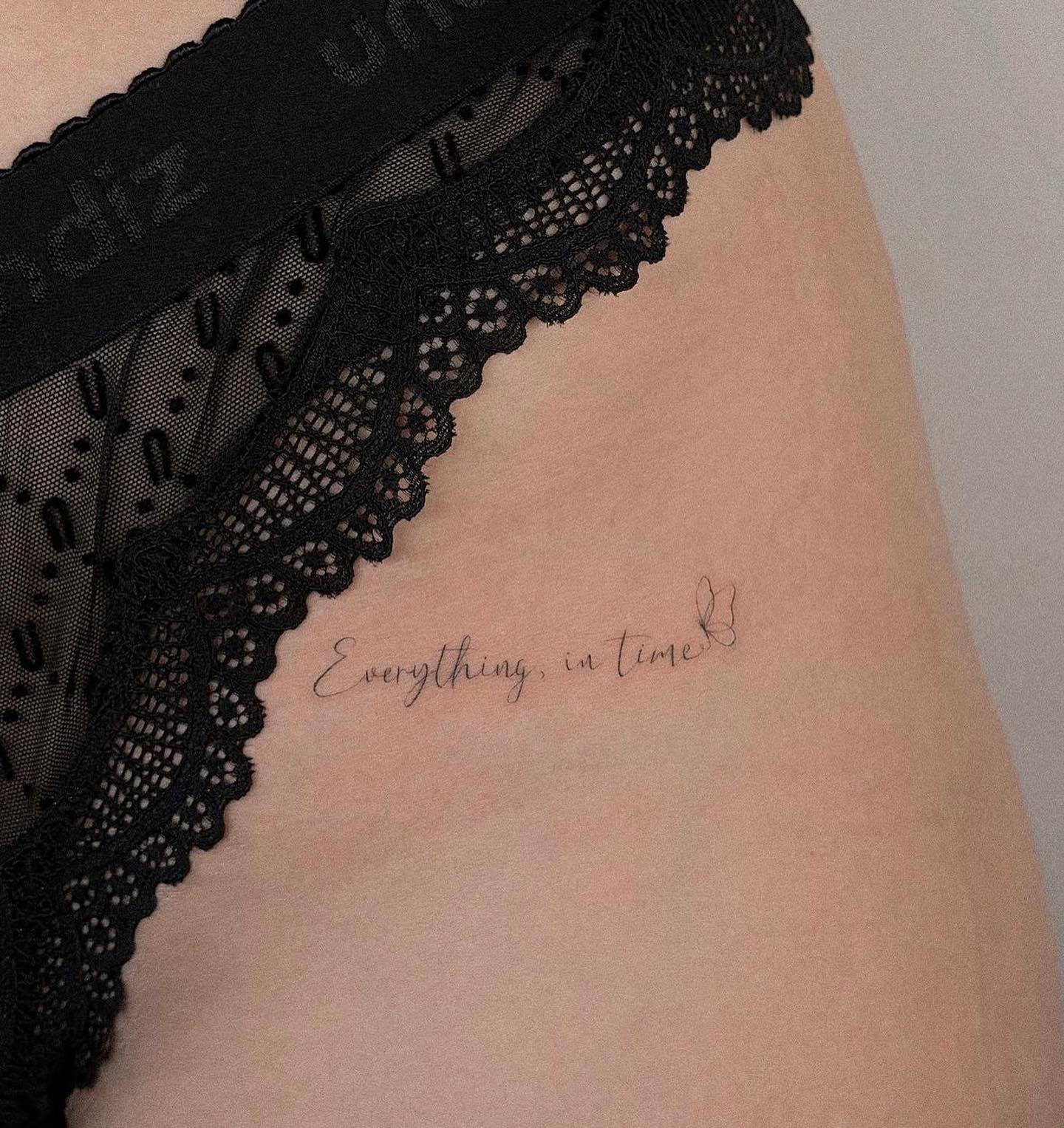 This image showcases a delicate tattoo that reads, “Everything, in time,” paired beautifully with a tiny butterfly. The elegant script captures a sense of hope and patience, making it a meaningful choice for anyone seeking inspiration. When choosing a fine tattoo, consider one that resonates with your personal journey, as it can serve as a constant reminder of your growth.
