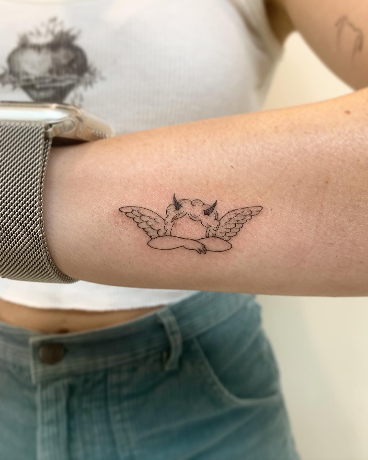 This tattoo captures a whimsical angel resting peacefully, complete with delicate wings and a playful expression. The design beautifully balances innocence and mischief, making it a perfect choice for those who appreciate a touch of fantasy in their ink. For anyone considering fine tattoos, choosing a design that reflects personal traits can create a meaningful connection.