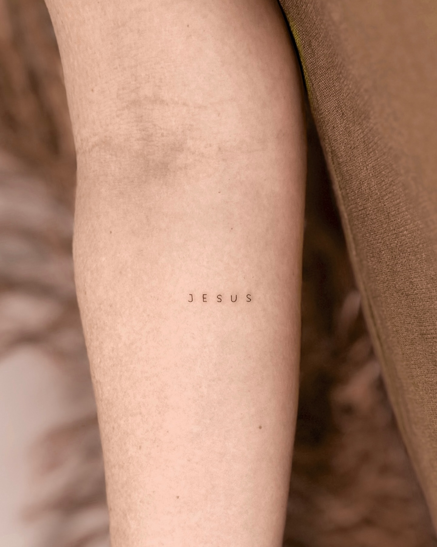 This tattoo features the word “JESUS” delicately inked in a simple, understated style. It captures a profound personal belief while maintaining a refined look that many women appreciate. Choosing a tattoo that reflects one’s values can create a meaningful connection to the art on their skin.