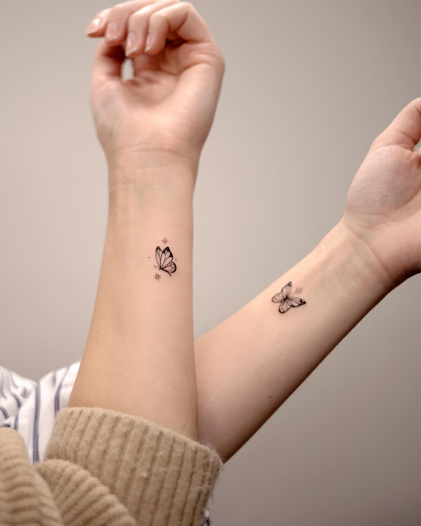 This image features delicate butterfly tattoos that add a touch of whimsy to the skin. The soft lines and subtle placement create an elegant look that feels both playful and refined. For anyone considering fine tattoos, choosing small and meaningful designs can reflect personal stories and interests beautifully.