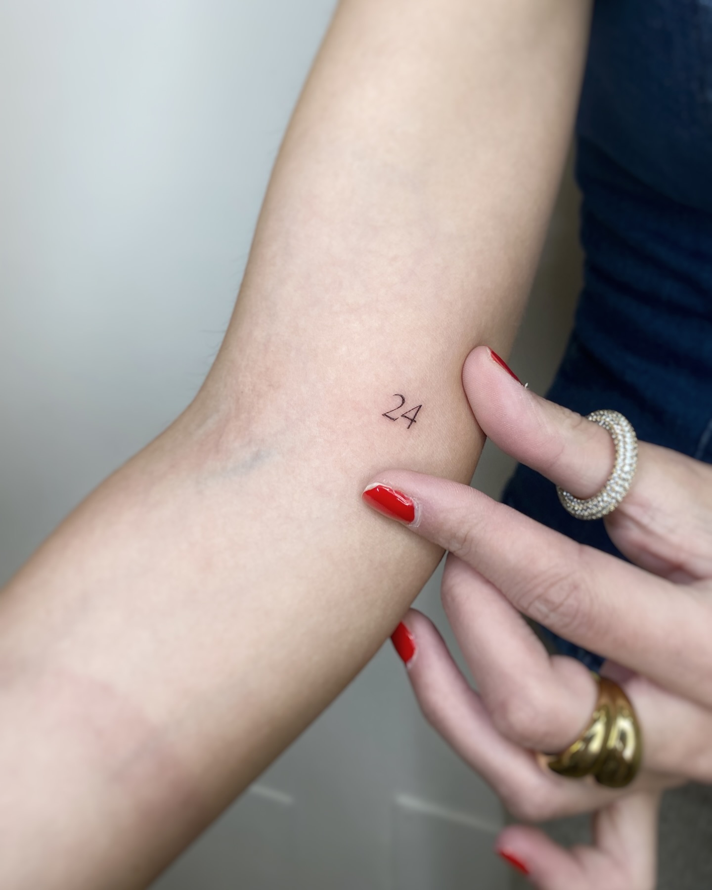 This image showcases a minimalist tattoo featuring the number 24, elegantly inked on the arm. Such simple yet meaningful designs can symbolize significant dates or milestones in one s life. When choosing a tattoo, it s essential to select something personal that resonates with your story.