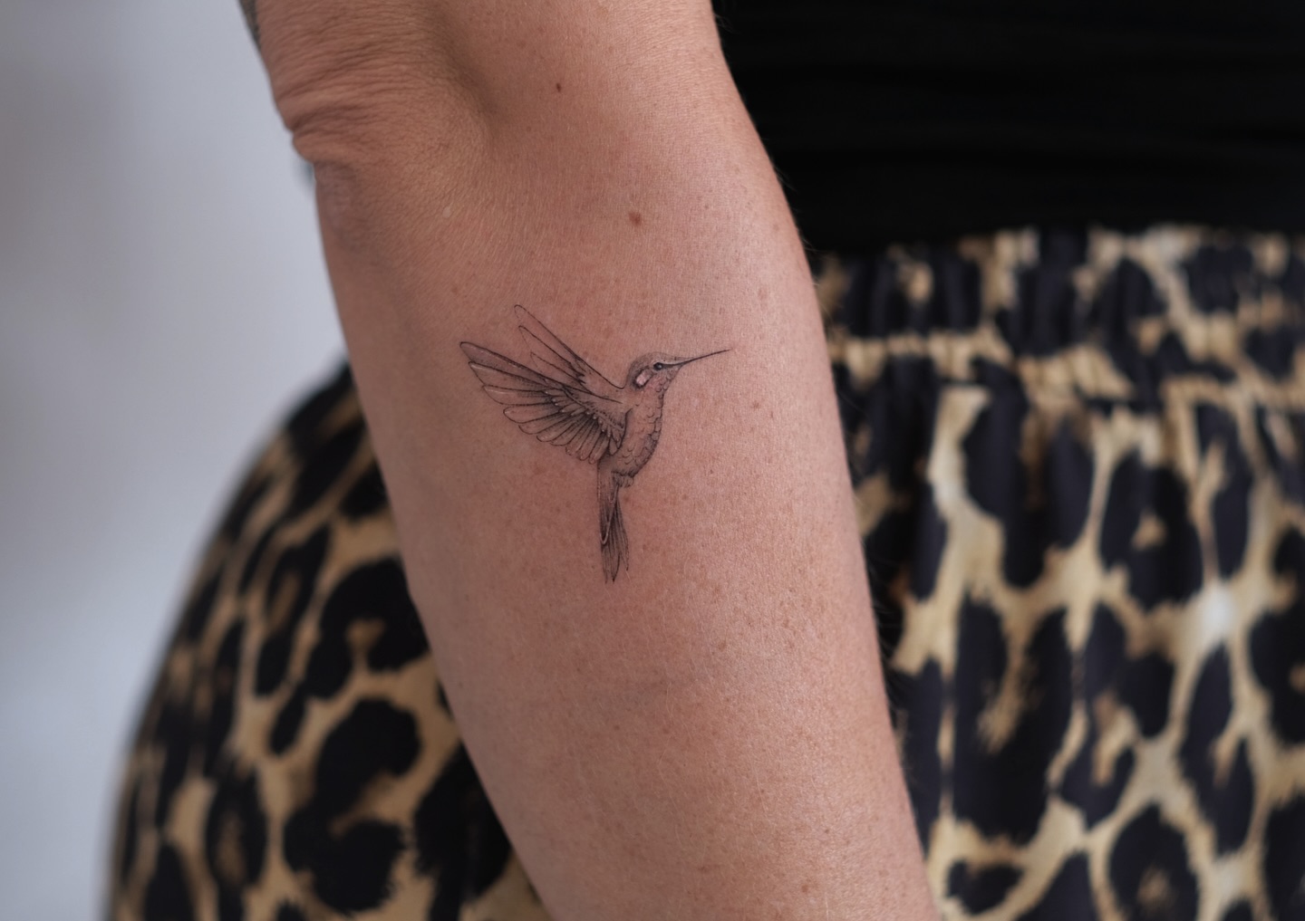 This delicate tattoo of a hummingbird showcases beauty in motion, capturing the essence of grace and freedom. The fine lines and intricate details make it a perfect choice for those looking to express their love for nature. Choosing a design that reflects personal interests can make a tattoo feel even more special.
