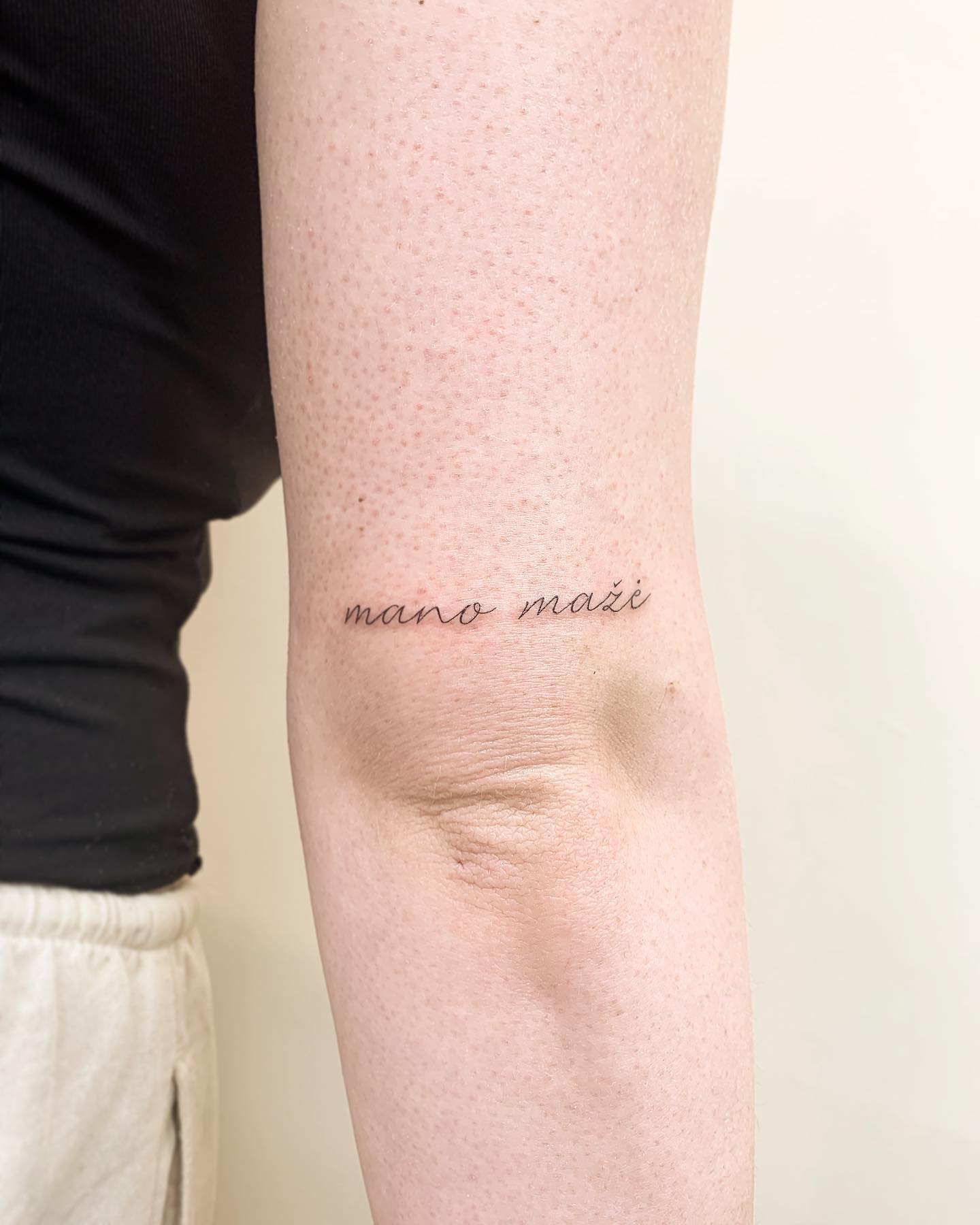 This tattoo beautifully showcases the phrase “mano mažÄ,” which translates to “my little hand.” It captures a heartfelt sentiment that many can relate to, making it a touching reminder of love and connection. Choosing fine tattoos for women often means selecting designs that hold personal meaning, and this one certainly does just that, blending simplicity with profound significance.