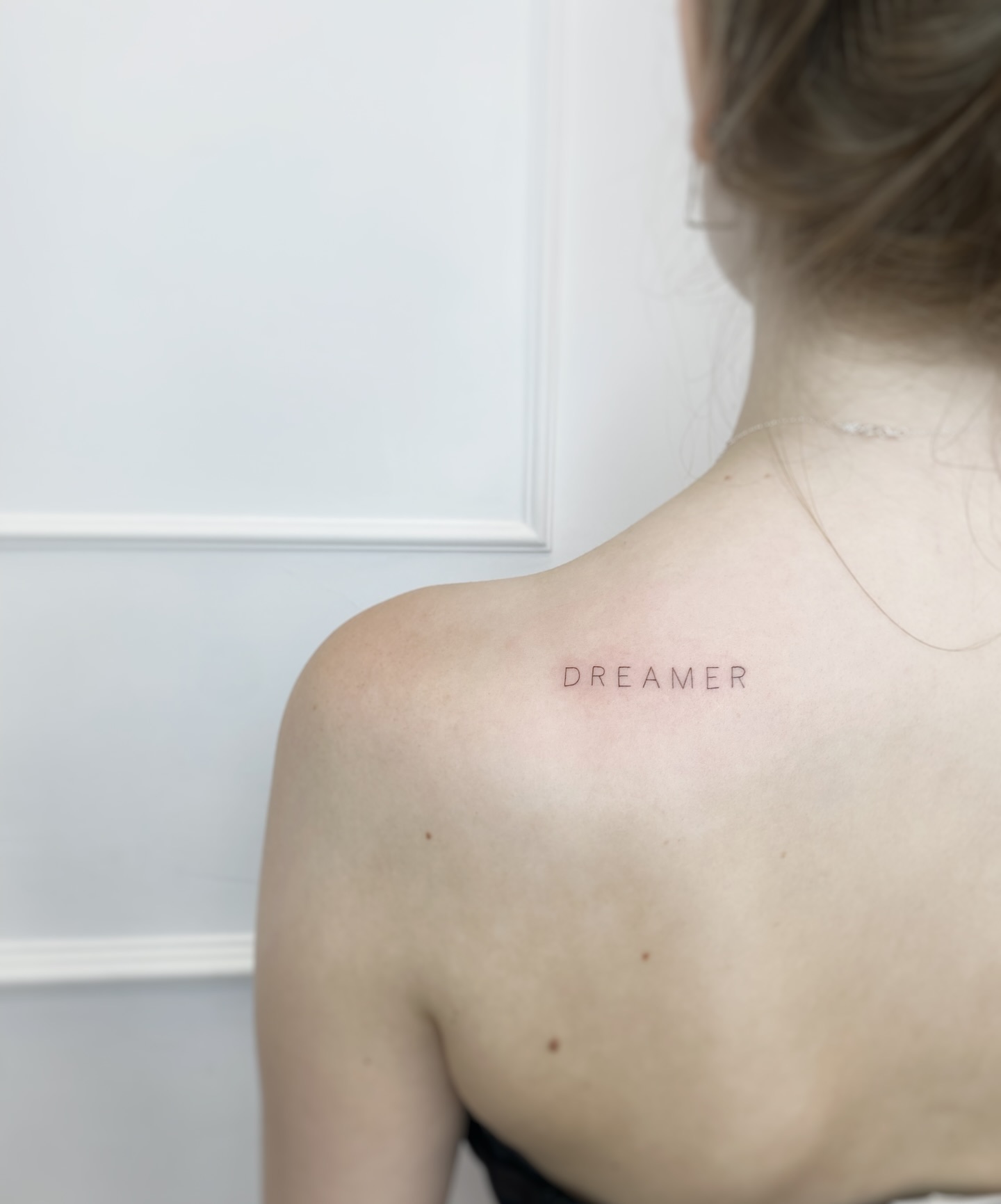 This tattoo captures a beautiful word, “DREAMER,” elegantly inked on the shoulder. The simplicity of the design makes it a charming choice for those who want their tattoos to carry a meaningful message without overwhelming detail. A delicate tattoo like this can serve as a daily reminder to chase one s dreams, adding a personal touch to any style.