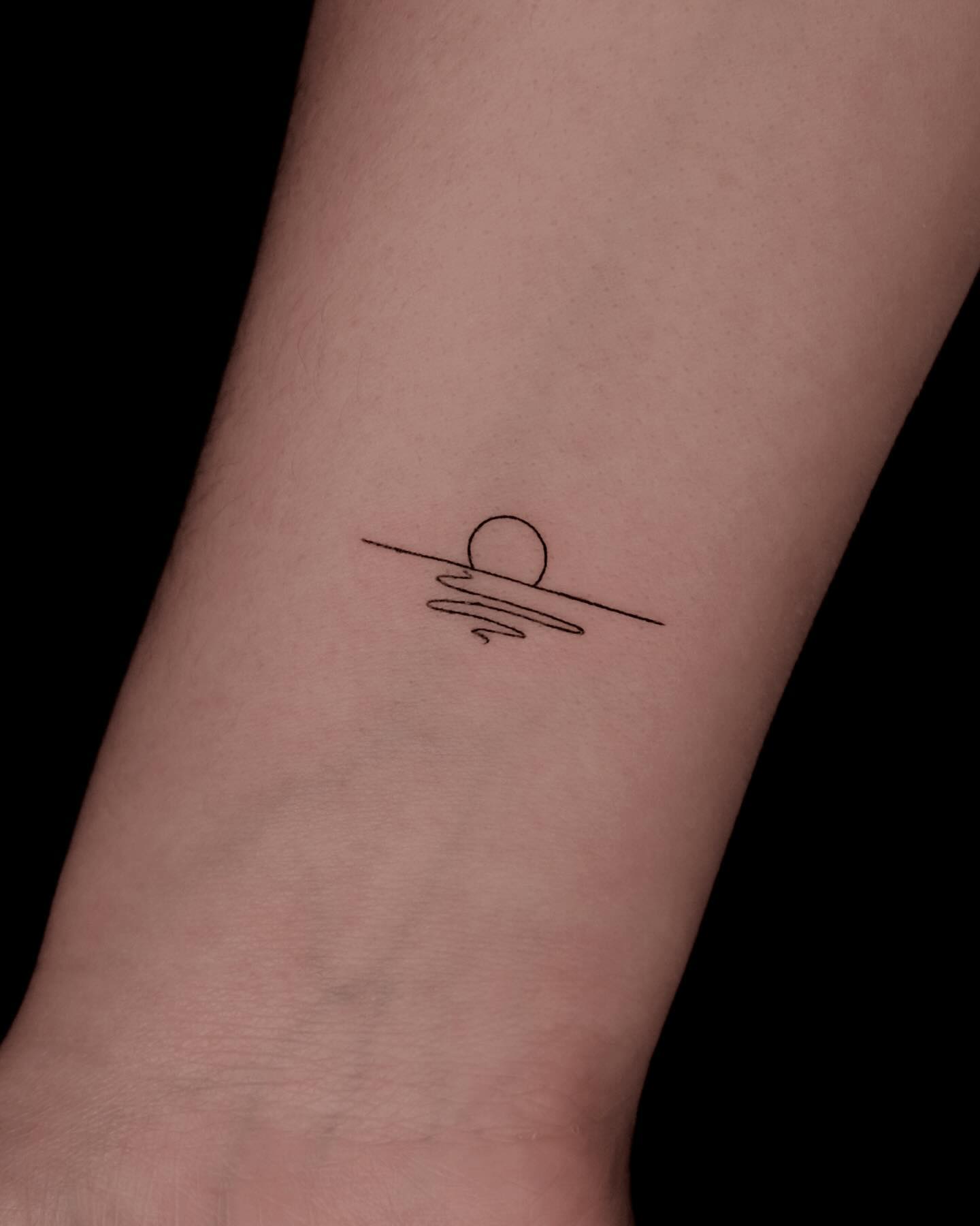 This tattoo features a simple yet captivating design of a sunset, showcasing the beauty of nature in a minimalist way. The delicate lines create a peaceful vibe, making it an ideal choice for those who appreciate subtle art. For anyone considering fine tattoos, this elegant piece serves as a reminder of the serene moments life has to offer.