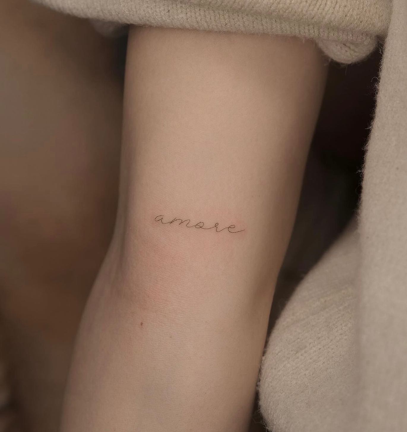 This tattoo beautifully showcases the word “amore” in a delicate, flowing script. Its soft lines and subtle placement make it a charming reminder of love and connection. For anyone considering fine tattoos, choosing a meaningful word can turn a simple design into a personal statement.