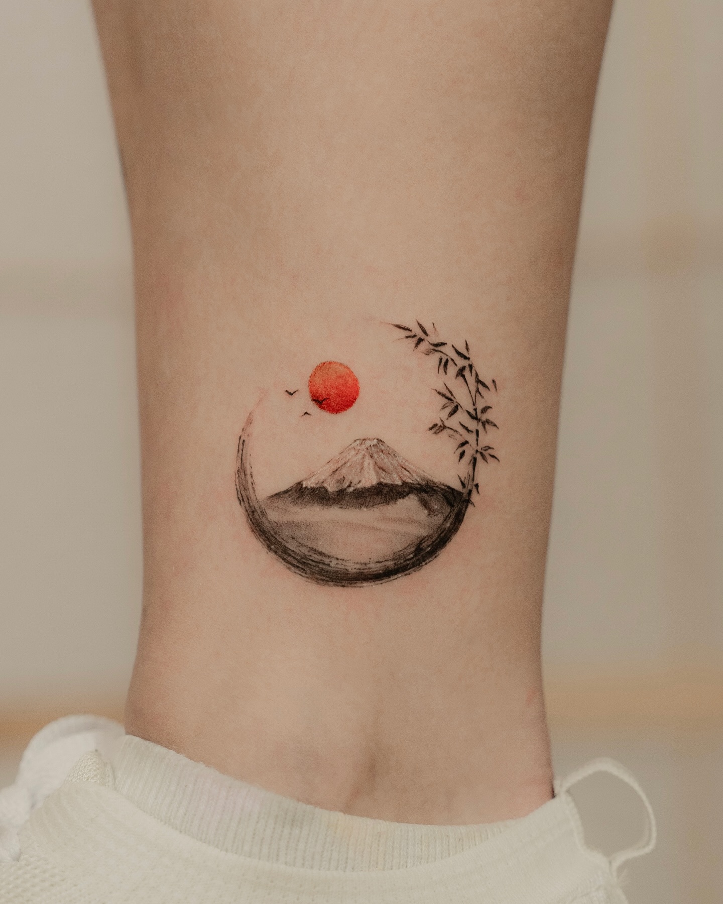This captivating tattoo beautifully captures a serene mountain landscape framed by delicate bamboo and a vibrant red sun. The blend of colors and fine details creates an artistic expression that resonates with nature lovers. For those considering fine tattoos, choosing a design that reflects personal interests can make the piece even more meaningful.
