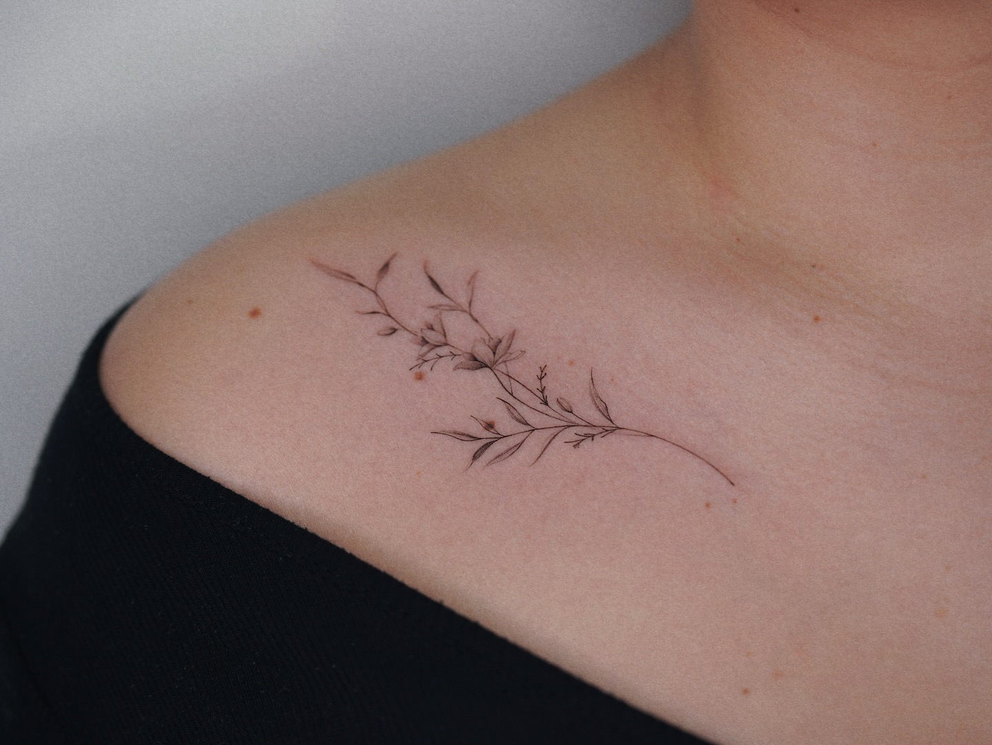 This delicate tattoo captures the beauty of nature with its fine line floral design, gracefully resting on the shoulder. The soft curves and intricate details of the leaves create a serene and feminine touch, making it a stunning choice for anyone wanting a subtle yet meaningful piece of art. A gentle reminder: when choosing a tattoo, consider its placement and how it complements your personal style.