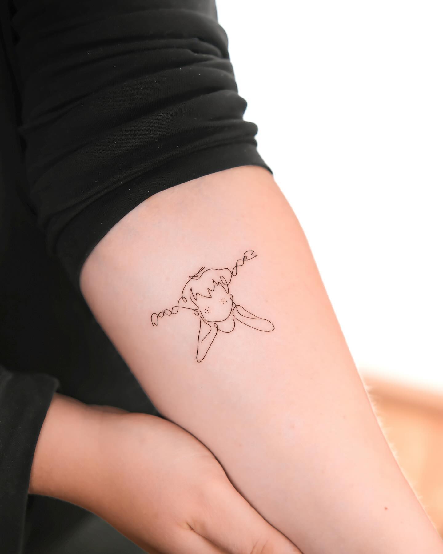 This charming tattoo captures a playful character with pigtails, radiating joy and innocence. The simple lines create a delightful design that s both fun and meaningful, inviting a smile from anyone who sees it. For those considering a fine tattoo, think about how a light-hearted design can reflect your personality and bring a touch of cheer to your everyday style.