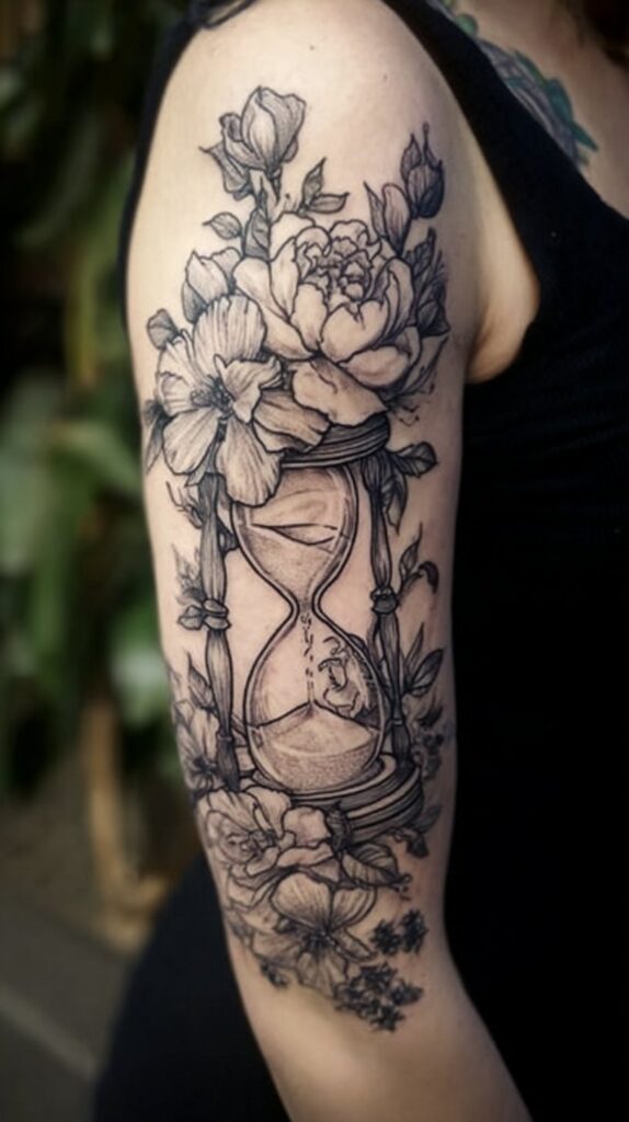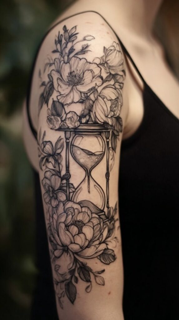 An hourglass and flower tattoo elegantly combines the symbolism of time with the beauty and fragility of life. The hourglass serves as a powerful reminder of the fleeting nature of time, urging us to cherish each moment and embrace the impermanence of existence.