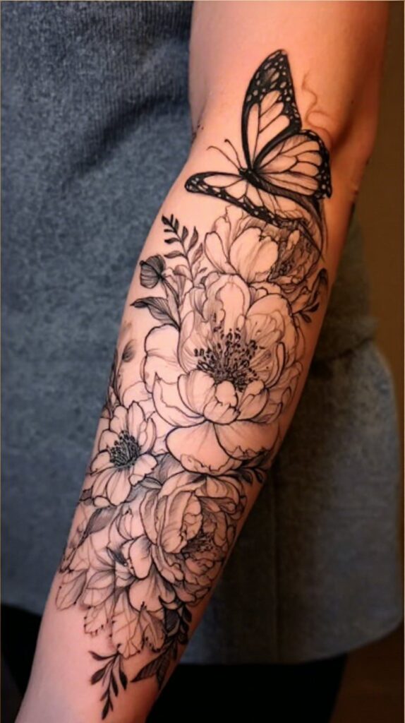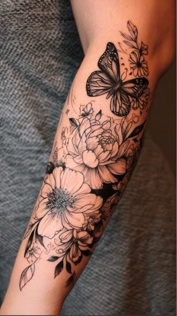 When paired with flowers, the tattoo gains added depth, reflecting beauty, serenity, and the cycle of life. Flowers in these tattoos often symbolize femininity, grace, and natural elegance, while the butterfly adds a sense of lightness and spiritual evolution.