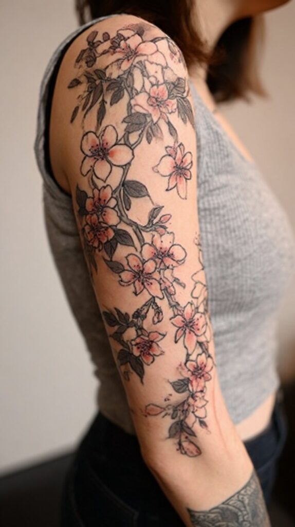 This style often features a collection of flowers, leaves, and botanical elements that flow naturally with the contours of the arm, giving the piece a lifelike and dynamic appearance. Each flower in the garden carries its symbolism, from roses representing love and passion to cherry blossoms symbolizing renewal and the fleeting nature of life.